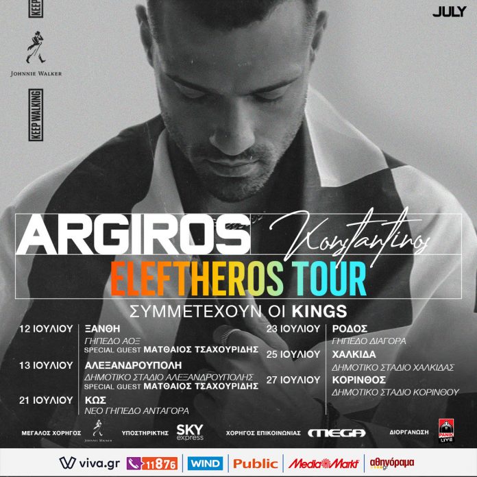 Ο Κωνσταντίνος Αργυρός, ο πιο επιτυχημένος λαϊκός καλλιτέχνης της γενιάς του, ταξιδεύει όλο το καλοκαίρι σε στάδια και μεγάλα θέατρα σε Ελλάδα και Κύπρο με μία μεγάλη μουσική παραγωγή, εξαιρετικής αισθητικής και υψηλών προδιαγραφών, το «Eleftheros Tour», με την υποστήριξη του Johnnie Walker.