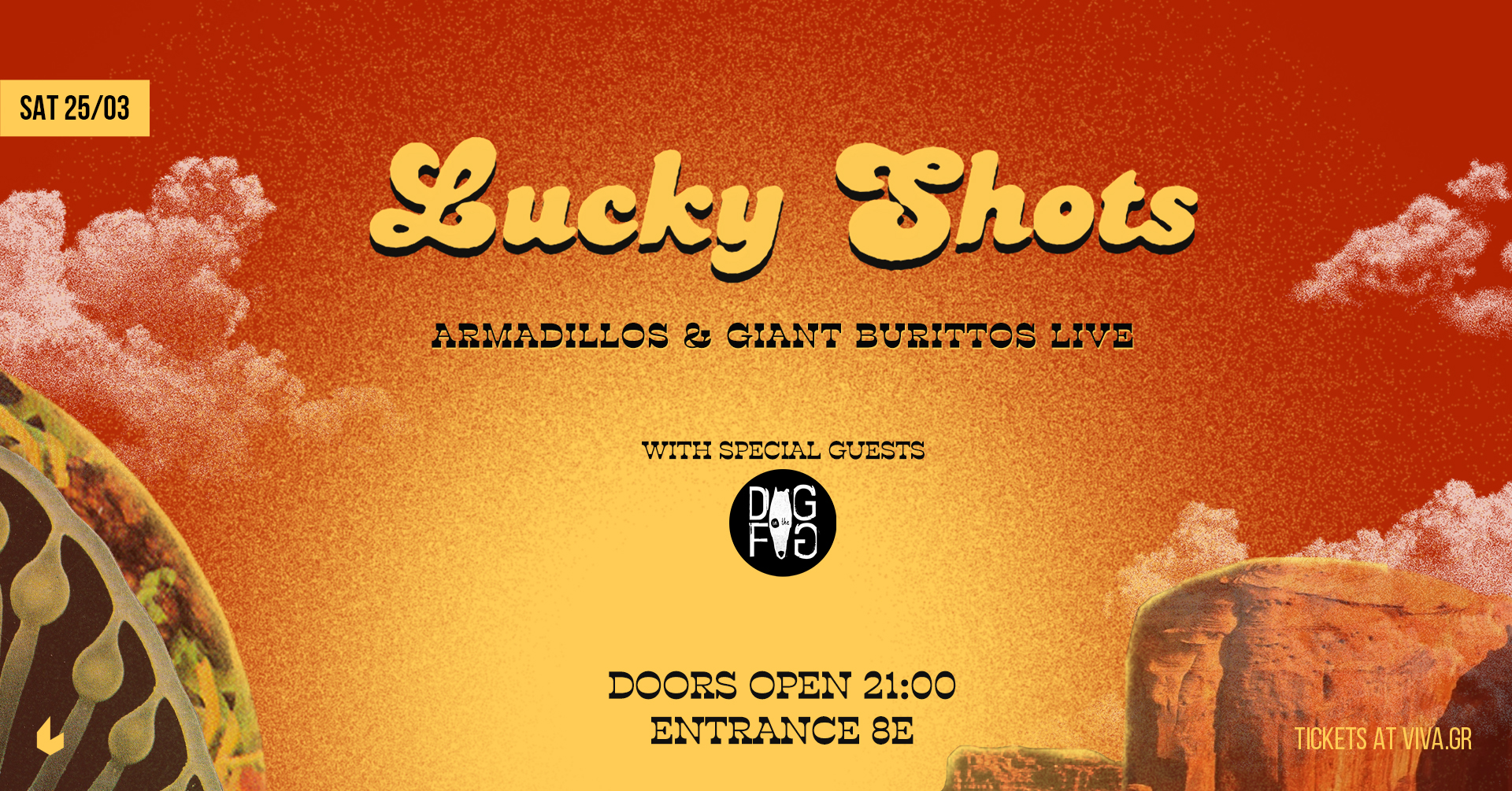 Οι Lucky Shots επιστρέφουν στις ζωντανές εμφανίσεις με αφορμή την κυκλοφορία του δεύτερου άλμπουμ τους με τίτλο ‘’Armadillos & Giant Burritos’’ που θα παρουσιάσουν το Σάββατο 25 Μαρτίου στο six d.o.g.s.