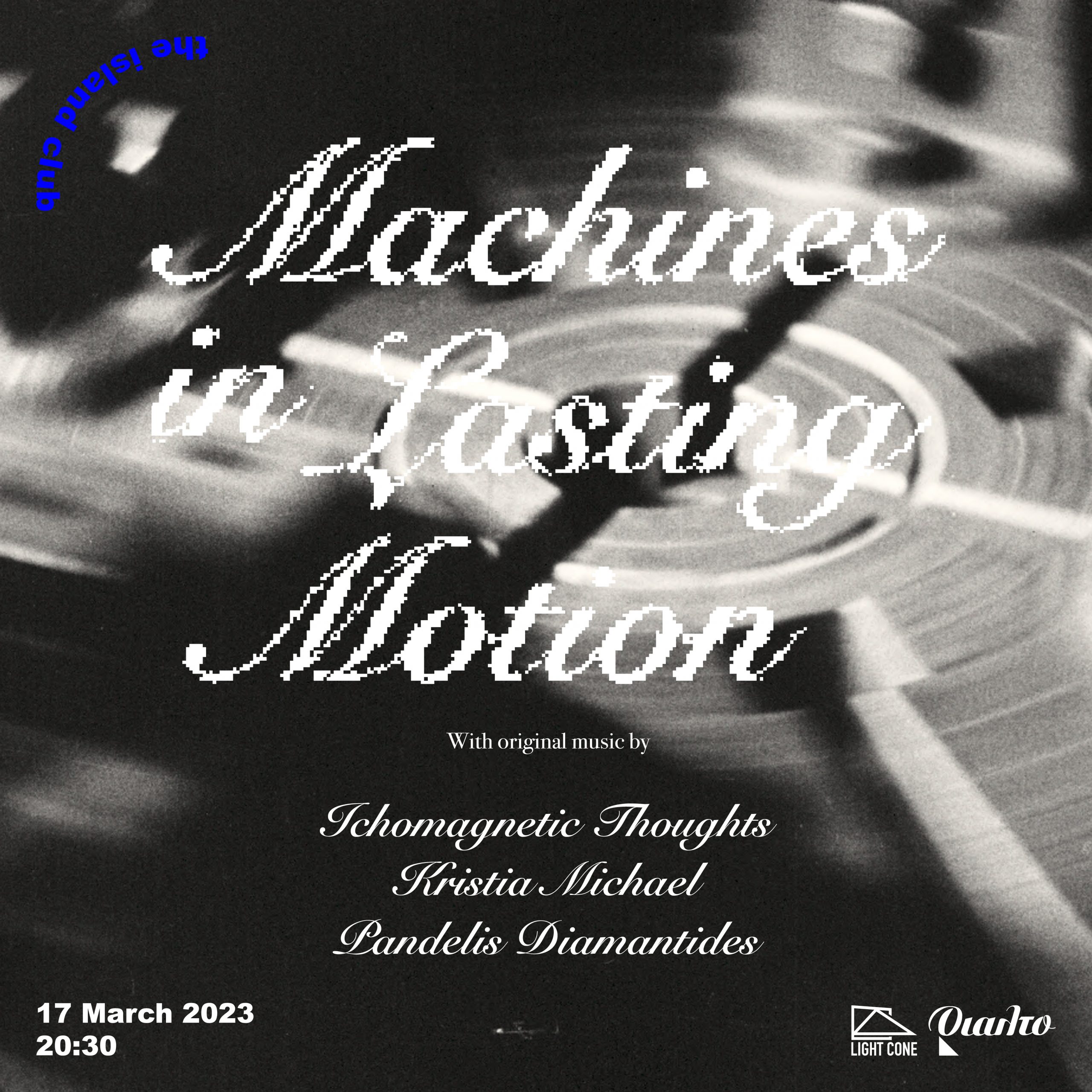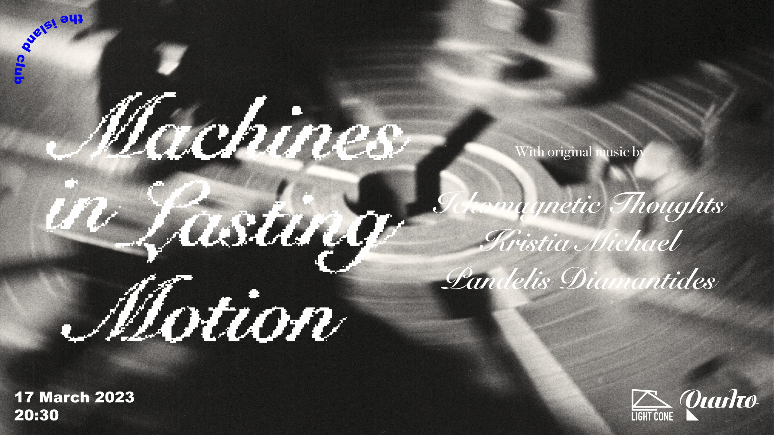 To The Island Club, σε συνεργασία με το Θέατρο Ριάλτο και την Light Cone, παρουσιάζει την οπτικοακουστική παράσταση Machines in Lasting Motion, ένα πρόγραμμα προβολών με ταινίες πρωτοπορίας από τις αρχές του 20ού αιώνα, που περιλαμβάνει έργα των Germaine Dulac, Ralph Steiner, Henri Chomette, Oswell Blakeston και Francis Bruguière. Μέσα από πειραματισμούς με το φως και την κίνηση, οι ταινίες διερευνούν από κοινού τις εκφραστικές ιδιότητες βιομηχανικών τεχνολογιών και εξοπλισμού, παραλληλίζοντας το ανθρώπινο στοιχείο με το μηχανικό.