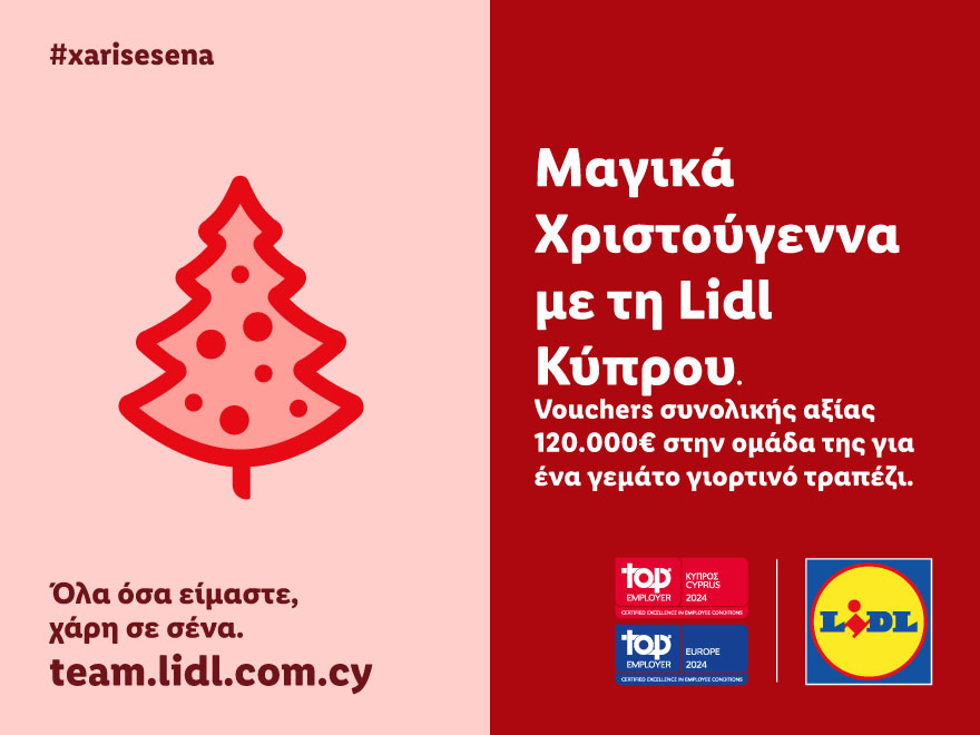 Στη Lidl Κύπρου, τα Χριστούγεννα είναι η εποχή που η προσφορά και η φροντίδα αποκτούν ακόμα μεγαλύτερη σημασία. Για τρίτη συνεχόμενη χρονιά, η εταιρεία στηρίζει έμπρακτα τους ανθρώπους της, προσφέροντάς τους Vouchers συνολικής αξίας 120.000€ για να γεμίσουν τα γιορτινά τους τραπέζια με χαρά, γεύσεις και ζεστασιά. Σε μία πρωτοβουλία που ξεχωρίζει στην Κυπριακή αγορά, η Lidl Κύπρου αναδεικνύει τη σημασία της κοινότητας και της αλληλεγγύης.