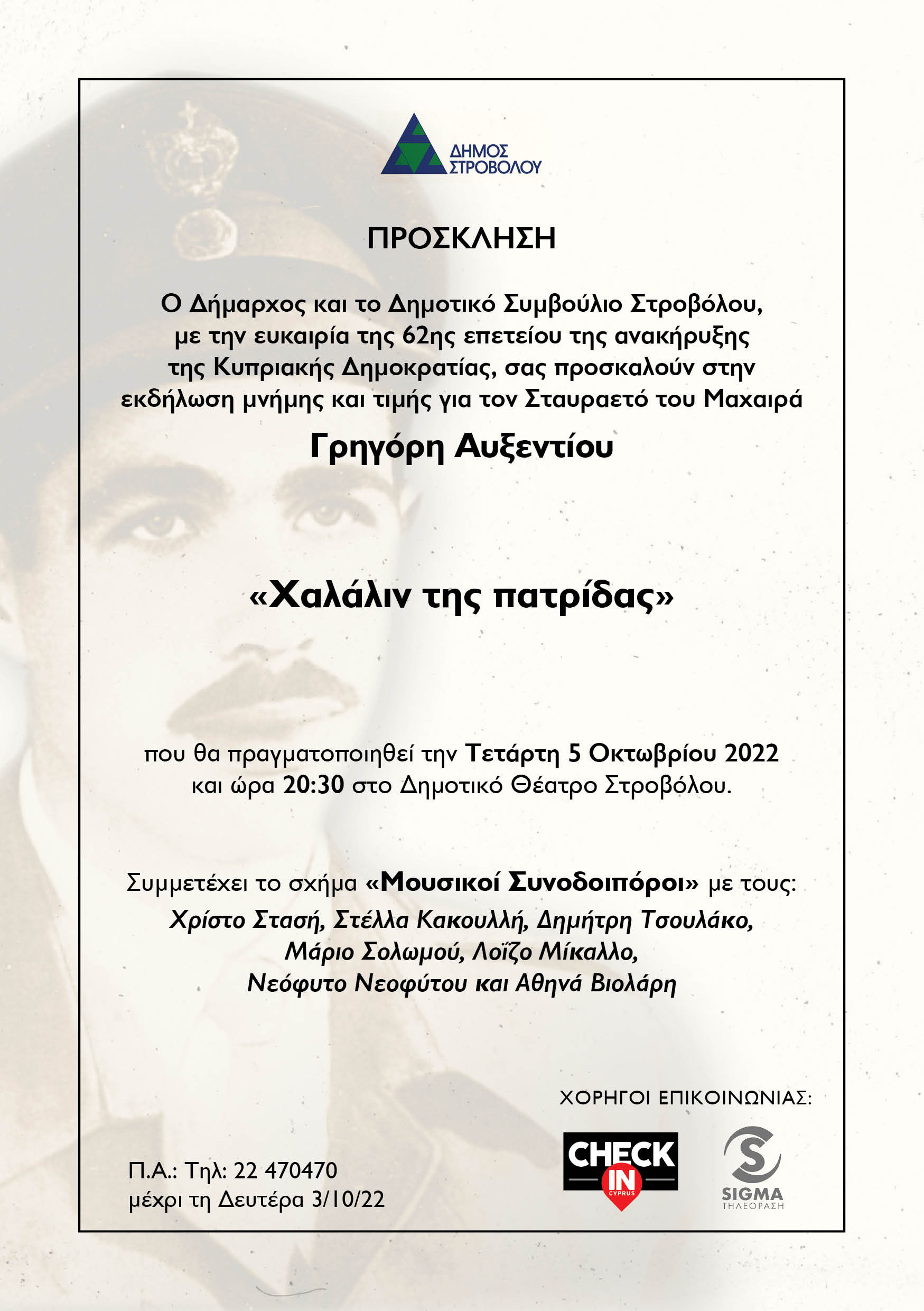 Ο Δήμος Στροβόλου παρουσιάζει την παράσταση «Χαλάλιν της Πατρίδας, ένα αφιέρωμα στον ήρωα Γρηγόρη Αυξεντίου, με το σχήμα «Μουσικοί Συνοδοιπόροι», την Τετάρτη, 5 Οκτωβρίου 2022 και ώρα 20:30, στο Δημοτικό Θέατρο Στροβόλου.