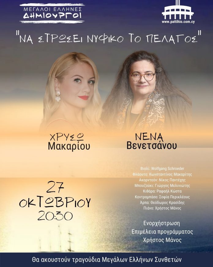 «Να στρώσει νυφικό το πέλαγος», ένα μουσικό αφιέρωμα στους Μεγάλους Έλληνες Συνθέτες, ανεβαίνει στις 27 Οκτωβρίου, στη σκηνή του Παττιχείου Δημοτικού Θεάτρου Λεμεσού, με ερμηνευτές τη σπουδαία τραγουδοποιό Νένα Βενετσάνου και την Κύπρια σοπράνο Χρύσω Μακαρίου.