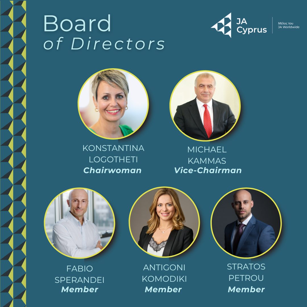 Το JA Cyprus καλωσορίζει το νέο Διοικητικό Συμβούλιο με ισχύ από 1η Σεπτεμβρίου 2024 έως μέχρι 30 Αυγούστου 2026. Πρόεδρος του οργανισμού αναλαμβάνει η κα. Κωνσταντίνα Λογοθέτη της PwC Κύπρου και Αντιπρόεδρος ο κ. Μιχάλης Καμμάς του Συνδέσμου Τραπεζών που μαζί με τα υπόλοιπα μέλη του ΔΣ του οργανισμού Ευστράτιο Πέτρου της MetLife, τον Fabio Sperandei της Novartis και την Αντιγόνη Κωμοδίκη του JA Κύπρου θα συμβάλλουν στην συνέχιση της επιτυχημένης πορείας του.