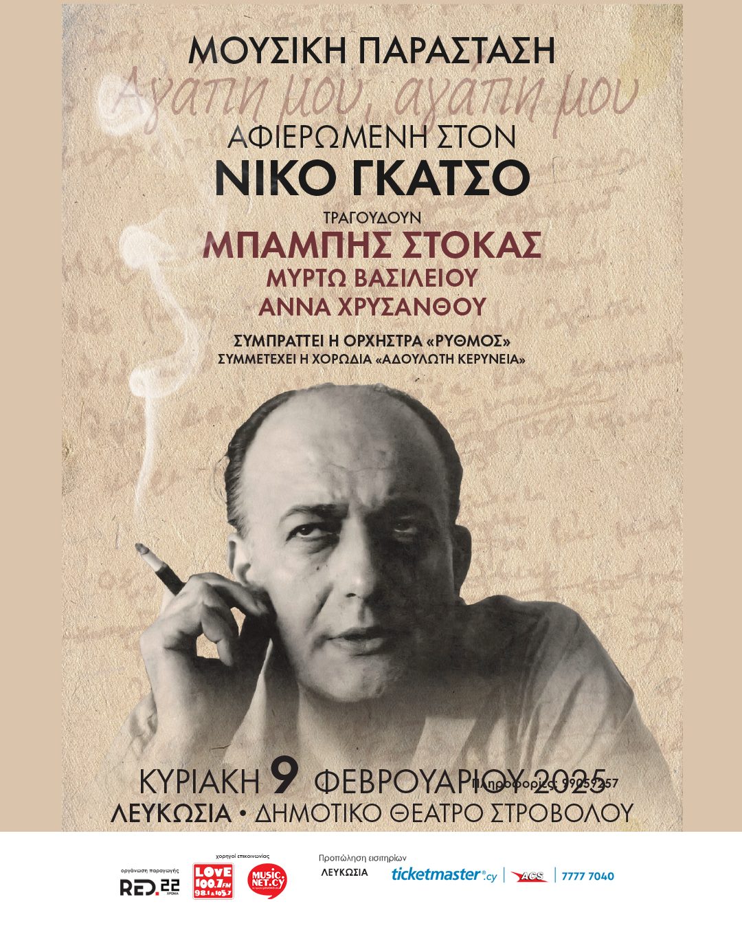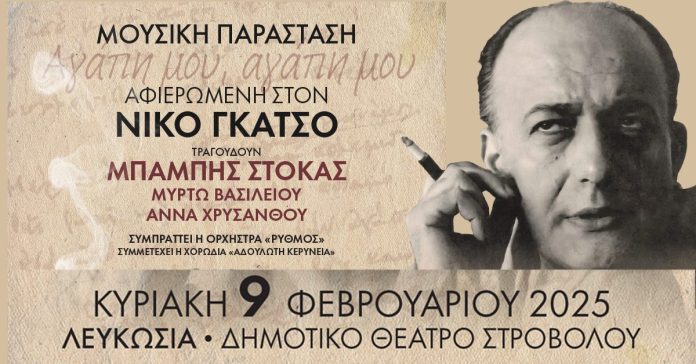 Μουσική παράσταση αφιερωμένη στο Νίκο Γκάτσο με τίτλο «Αγάπη μου, αγάπη μου» παρουσιάζεται την Κυριακή 9 Φεβρουαρίου στο Δημοτικό Θέατρο Στροβόλου.