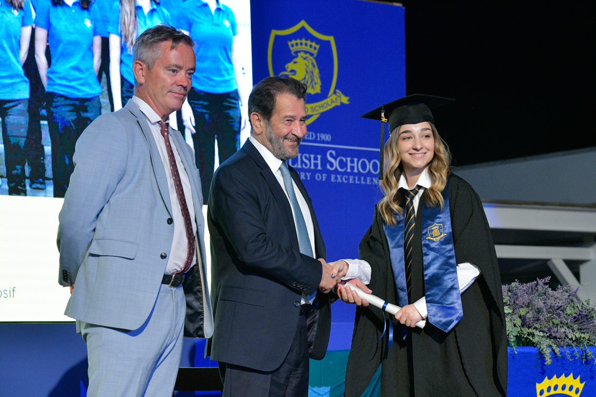 Συνολικά, 150 μαθητές αποφοίτησαν φέτος από την Αγγλική Σχολή, κατά τη διάρκεια της εμπνευσμένης τελετής στην οποία παρευρέθηκαν οι περήφανοι γονείς και κηδεμόνες τους. Μαζί με τα απολυτήριά τους, ορισμένοι απόφοιτοι έλαβαν βραβεία ακαδημαϊκής αριστείας για επιτεύγματα σε μια σειρά θεμάτων, καθώς και βραβεία για την εξαιρετική συνεισφορά τους στη συζήτηση και τη δημόσια ομιλία, στη μουσική, καθώς και στον αθλητισμό.