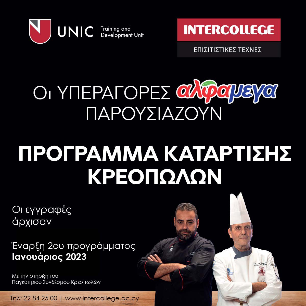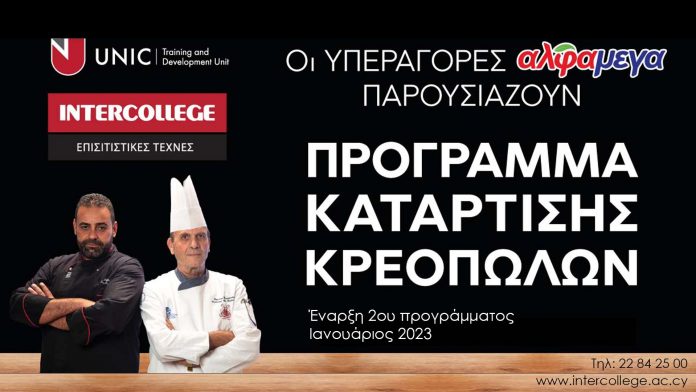 Για περισσότερες πληροφορίες σχετικά με το Πρόγραμμα Κατάρτισης Κρεοπωλών καλέστε στο 22842500 (Intercollege) και επισκεφθείτε τις ιστοσελίδες www.alphamega.com.cy και www.intercollege.ac.cy