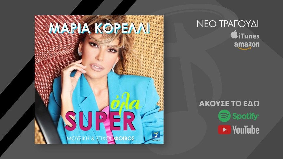 Η Μαρία Κορέλλι, η ταλαντούχα και εκρηκτική τραγουδίστρια που πρωταγωνιστεί στη νυχτερινή Αθήνα, έρχεται με ακόμη μία επιτυχία με τίτλο «Όλα SUPER» την οποία υπογράφει, για ακόμη μία φορά, ο δημιουργός των μεγαλύτερων επιτυχιών, ΦΟΙΒΟΣ.