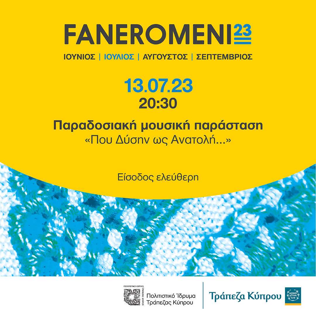 Το πετυχημένο Φεστιβάλ Τεχνών Φανερωμένη23 του Πολιτιστικού Ιδρύματος Τράπεζας Κύπρου, συνεχίζει τις όμορφες βραδιές του με τη μουσική παράσταση παραδοσιακής μουσικής και κεραμικής «Που Δύσην ως Ανατολή…», την Πέμπτη 13 Ιουλίου.