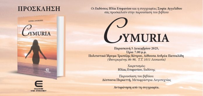 Οι Εκδόσεις Ηλία Επιφανίου και η συγγραφέας Σοφία Αγγελίδου σας προσκαλούν στην παρουσίαση του αλληγορικού μυθιστορήματος CYMURIA, που θα πραγματοποιηθεί την Παρασκευή, 5 Δεκεμβρίου 2025, στις 19:00, στο Πολιτιστικό Ίδρυμα της Τράπεζας Κύπρου.