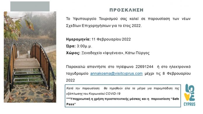 Το Υφυπουργείο Τουρισμού σας καλεί σε παρουσίαση των νέων Σχεδίων Επιχορηγήσεων για το έτος 2022. Θα πραγματοποιηθεί ΜΙΑ παρουσίαση στον Κάτω Πύργο: