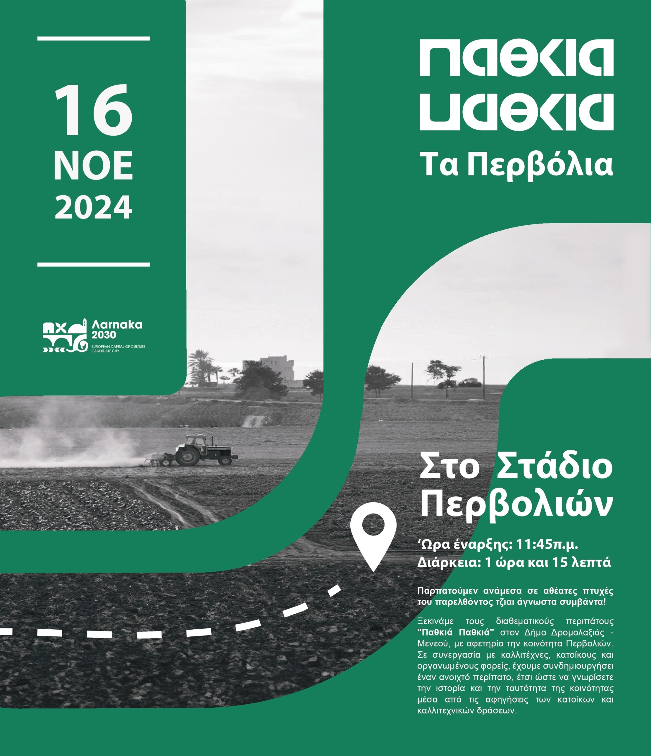 Στο πλαίσιο των δράσεων του Οργανισμού Λάρνακα 2030, που τρέχει την υποψηφιότητα της πόλης ως Πολιτιστική Πρωτεύουσα της Ευρώπης για το έτος 2030, οργανώνονται πέντε διαθεματικοί περίπατοι με τον τίτλο “Παθκιά Παθκιά” στις κοινότητες του νεοσύστατου Δήμου Δρομολαξίας – Μενεού. Ξεκινάμε με την κοινότητα Περβολιών στις 16 Νοεμβρίου.