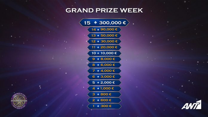 Το «Ποιος θέλει να γίνει εκατομμυριούχος;» με τον Γρηγόρη Αρναούτογλου έρχεται με 3 συναρπαστικές εβδομάδες Grand Prize, σε κάθε μία από τις οποίες διεξάγεται ένα mini πρωτάθλημα 4 ημερών, που κορυφώνεται με τον μεγάλο τελικό, όπου οι παίκτες διεκδικούν το μεγάλο έπαθλο των 300.000€!
