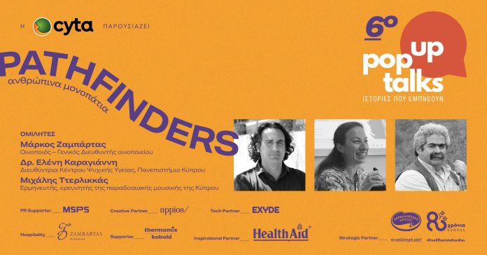 Το Pop Up Talks, που παρουσιάζεται από τη Cyta, επιστρέφει με το 6ο κατά σειρά event του, με τίτλο “Pathfinders – Ανθρώπινα Μονοπάτια”, το Σάββατο 15 Νοεμβρίου, στις 17:00, στο Οινοποιείο Ζαμπάρτα στον Άγιο Αμβρόσιο Λεμεσού.