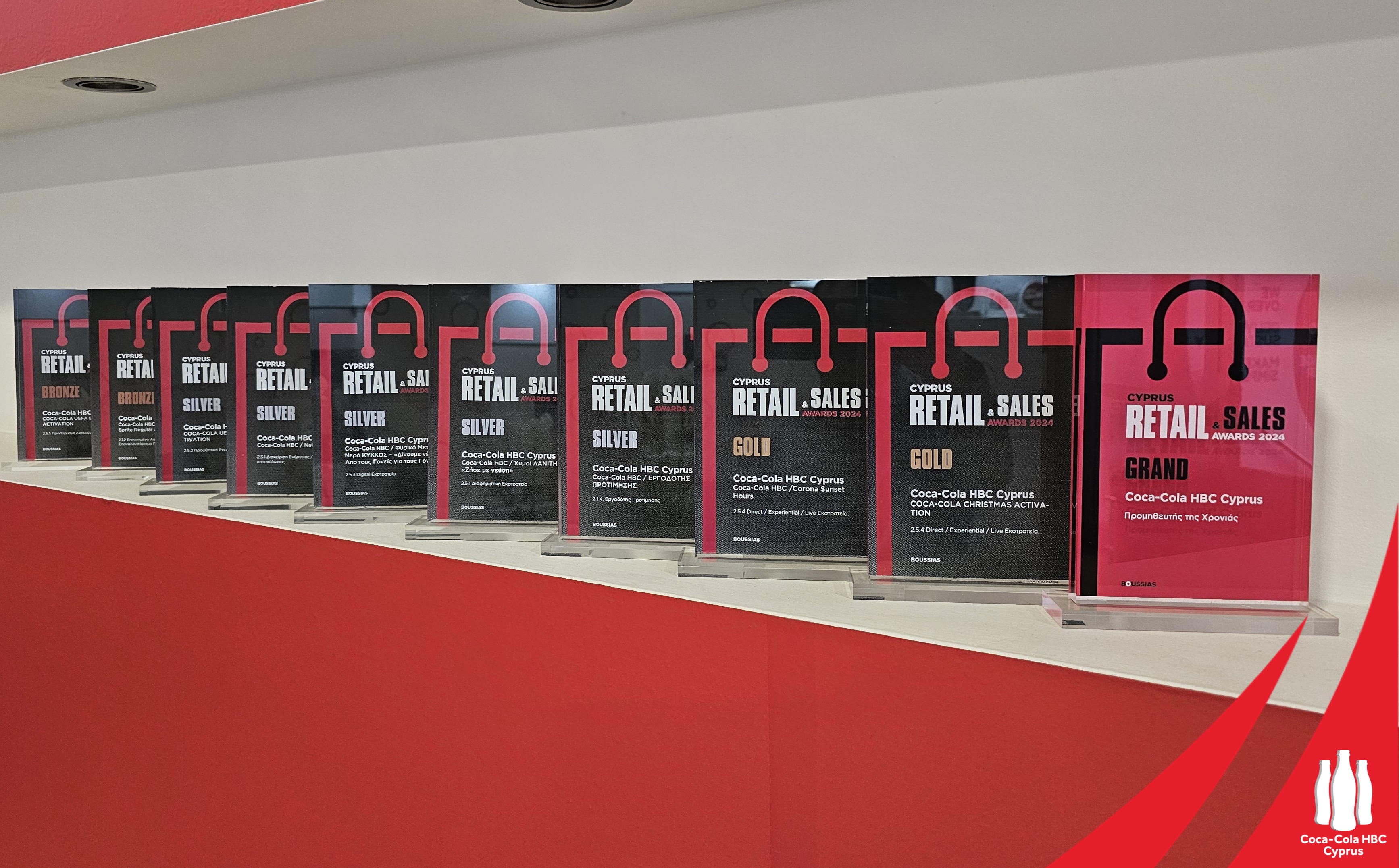 Η Coca-Cola HBC Κύπρου τιμήθηκε με συνολικά δέκα βραβεία, δύο Gold, πέντε Silver και δύο Bronze, και με το μεγάλο βραβείο «Προμηθευτής της χρονιάς 2024», γεγονός που αναδεικνύει τη σφαιρική, καινοτόμο και υπεύθυνη προσέγγισή της στην αγορά. Από επιτυχημένες καταναλωτικές εκστρατείες, μέχρι δράσεις περιβαλλοντικής υπευθυνότητας και ενδυνάμωσης του ανθρώπινου δυναμικού της, η εταιρεία ξεχώρισε για την ολοκληρωμένη της στρατηγική.