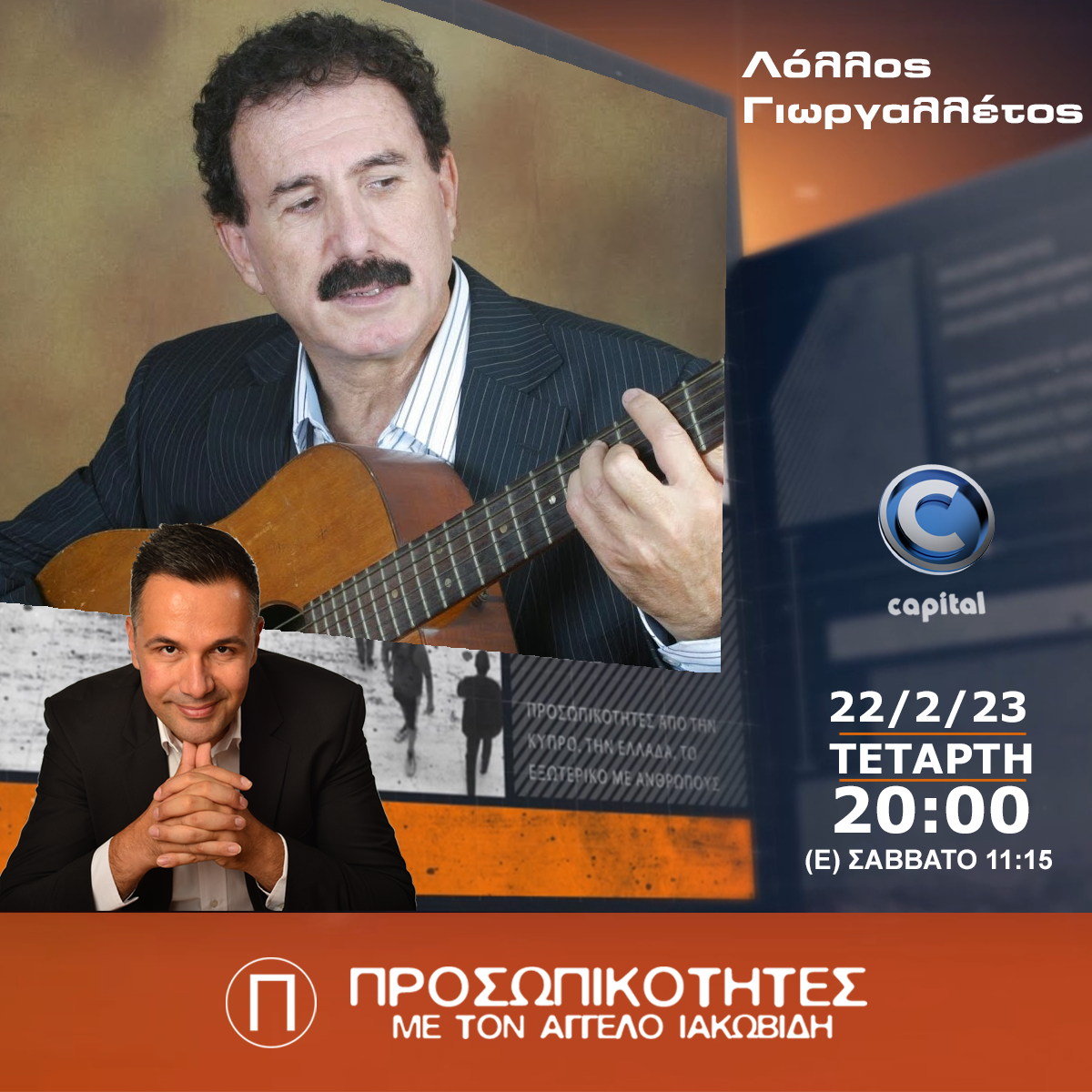 Ο Λόλλος Γιωργαλλέτος, φιλοξενείται στην εκπομπή Προσωπικότητες με τον Άγγελο Ιακωβίδη αυτή την Τετάρτη 15/2/23 στις 8 το βράδυ στο Capital. Η εκπομπή μεταδίδεται και σε επανάληψη κάθε Σάββατο στις 11:15 το πρωί.