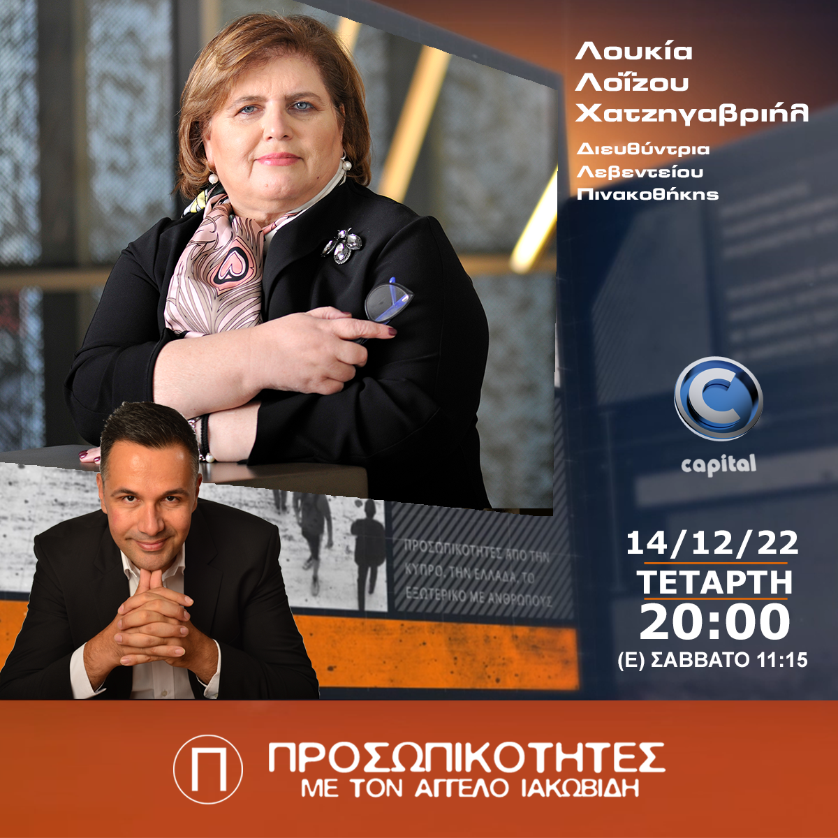 Η Λουκία Λοΐζου Χατζηγαβριήλ, Διευθύντρια της Λεβεντείου Πινακοθήκης φιλοξενείται στην εκπομπή Προσωπικότητες με τον Άγγελο Ιακωβίδη αυτή την Τετάρτη 14/12/22 στις 8 το βράδυ στο Capital. Η εκπομπή μεταδίδεται και σε επανάληψη κάθε Σάββατο στις 11:15 το πρωί.