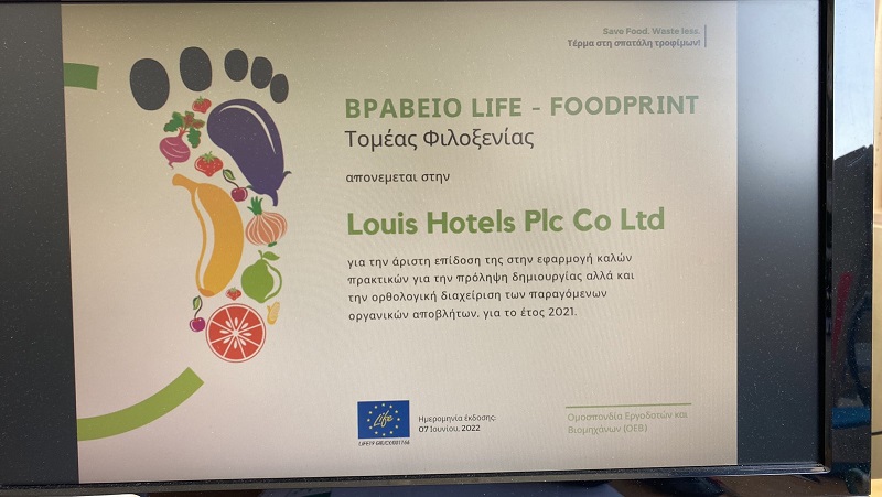 Φέτος τον Ιούνιο η Louis Hotels απέσπασε δύο σημαντικές διακρίσεις. Η πρώτη χρονικά ήρθε στις 7 Ιουνίου από την ΟΕΒ στο πλαίσιο του προγράμματος «Life Food Print», που στόχο έχει την ανάδειξη των επιχειρήσεων που προωθούν καλές πρακτικές μείωσης σπατάλης τροφίμων και αποβλήτων τροφίμων. Οι βραβευθέντες επιλέγηκαν μέσω διαγωνισμού της ΟΕΒ προς τα μέλη της κατά την περίοδο Σεπτεμβρίου – Νοεμβρίου 2021. Οι επιχειρήσεις που συμμετείχαν εξετάστηκαν ως προς την περιβαλλοντική πολιτική που εφαρμόζουν, τις πρωτοβουλίες και εθελοντικές δράσεις/ενέργειες που πραγματοποιούν για την ενημέρωση και ευαισθητοποίηση του προσωπικού και των πελατών τους, όπως επίσης και τους διάφορους κανονισμούς που εφαρμόζουν και συμβάλλουν στη μείωση της σπατάλης τροφίμων και στην καλύτερη αξιοποίηση των πρώτων υλών τροφίμων. Αξίζει να σημειωθεί ότι τη συγκεκριμένη διάκριση έλαβαν μόνο τρεις επιχειρήσεις, με τη Louis Hotels να είναι μία από αυτές.