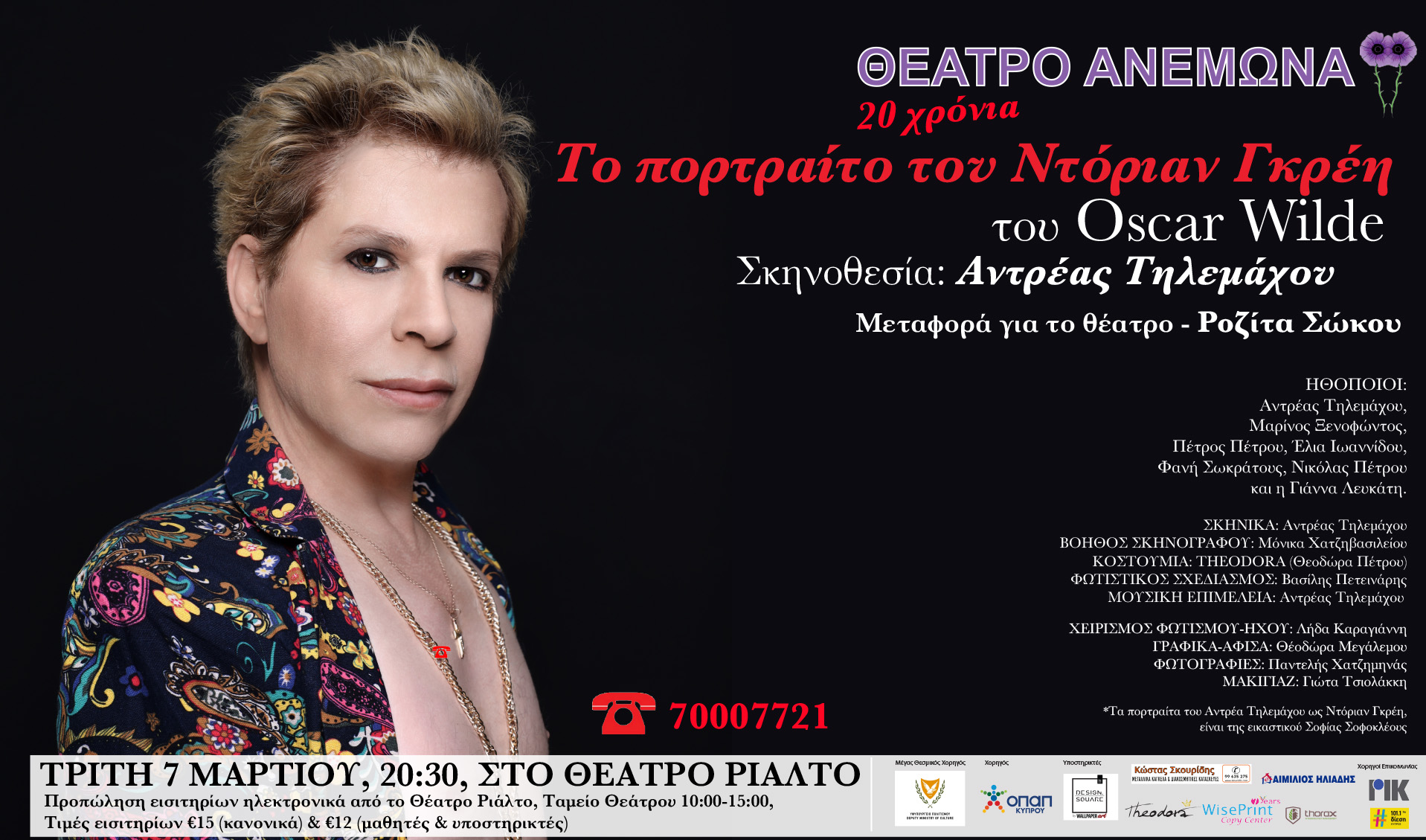 Με το επετειακό ανέβασμα του σπουδαίου αυτού έργου, το θέατρο Ανεμώνα γιορτάζει τη συμπλήρωση 20 χρόνων αδιάλειπτης παρουσίας και προσφοράς στο πολιτιστικό γίγνεσθαι του τόπου. Η επιτυχημένη θεατρική μεταφορά του αριστουργηματικού μυθιστορήματος του Όσκαρ Ουάιλντ “Το Πορτραίτο του Ντόριαν Γκρέη” από τη σημαντικότατη κριτικό θεάτρου-κινηματογράφου και συγγραφέα Ροζίτα Σώκου, ανέβηκε στην πρώτη σκηνή του θεάτρου Ανεμώνα πριν από 17 χρόνια(που καταστράφηκε από τον τυφώνα στα Λατσιά το 2009), γνωρίζοντας ιδιαίτερη επιτυχία και αποτελώντας σταθμό στην ιστορία του θεάτρου.