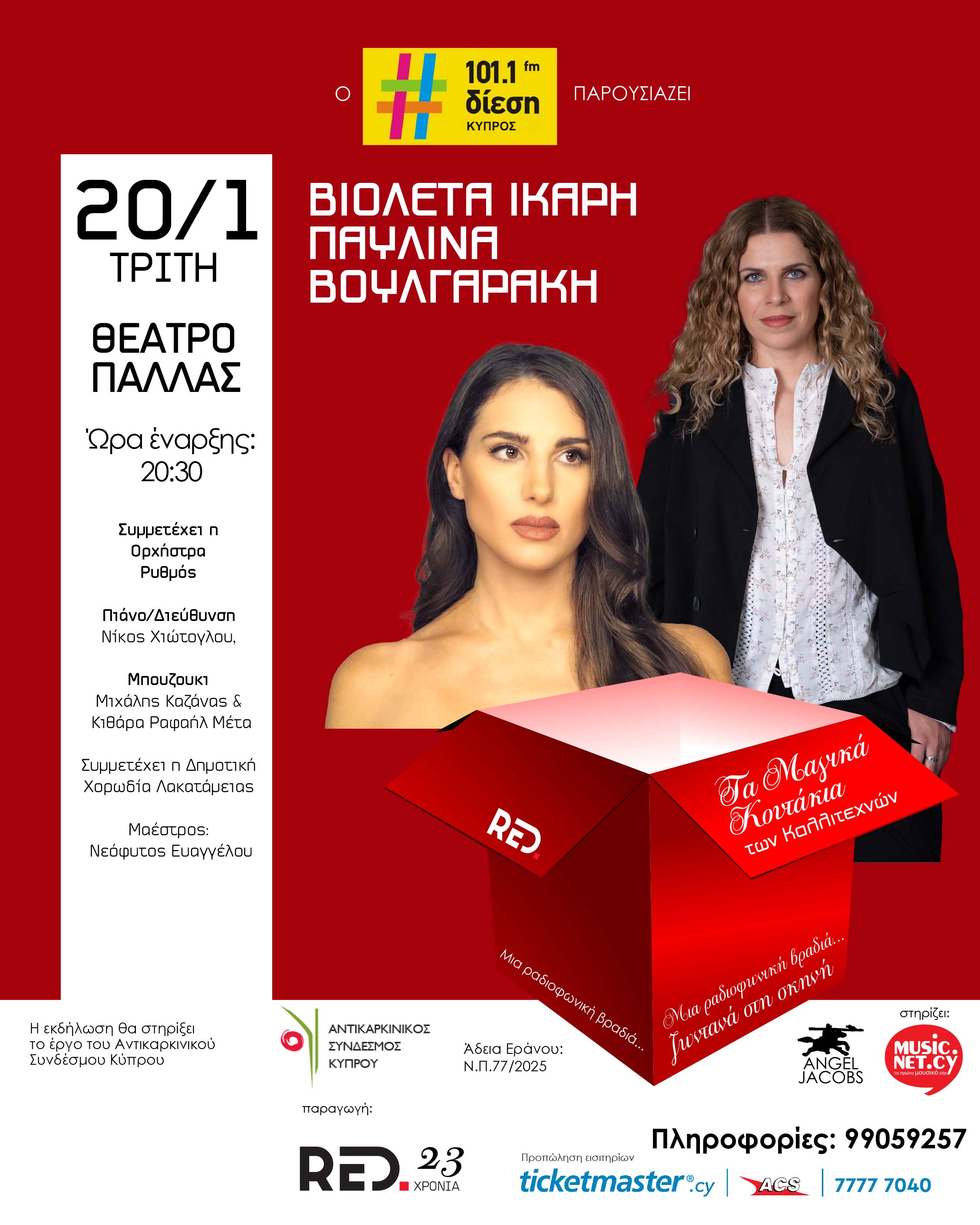 Το music.net.cy ως χορηγός επικοινωνίας προσφέρει στους επισκέπτες του δωρεάν προσκλήσεις για την συναυλία της Βιολέτας Ίκαρη και της Παυλίνας Βουλγαράκη που συναντιούνται στα «Μαγικά Κουτάκια των Καλλιτεχνών» σε μια βραδιά γεμάτη συναίσθημα, φωνές που μπλέκονται και ιστορίες που αξίζουν να ειπωθούν. 20 Ιανουαρίου. Θέατρο Παλλάς. Ωρα: 20.30