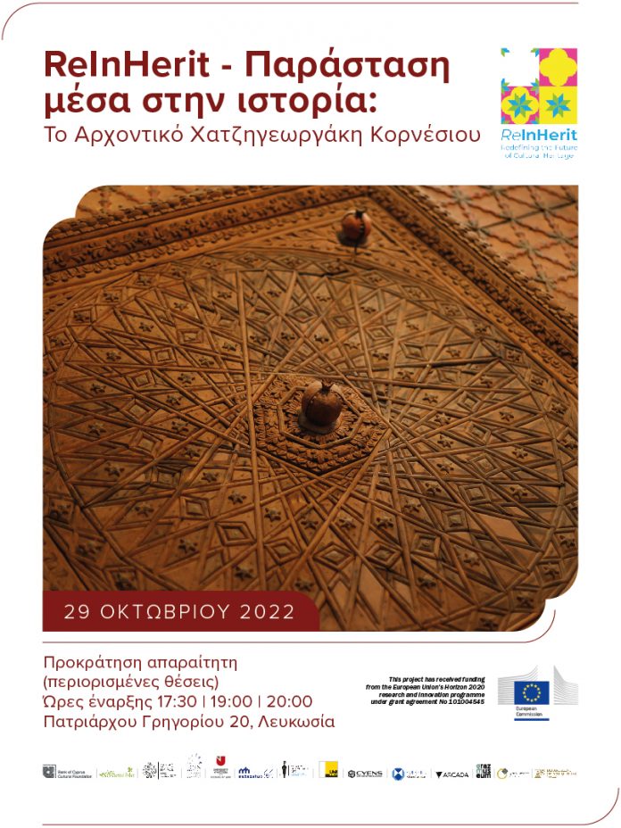 Η εκδήλωση «ReInHerit – Παράσταση μέσα στην ιστορία: Το Αρχοντικό Χατζηγεωργάκη Κορνέσιου» αποτελεί μια από τις εκδηλώσεις που διοργανώνονται ως περιπτωσιολογικές μελέτες στο πλαίσιο του ερευνητικού προγράμματος ReInHerit “Redefining the Future of Culture Heritage: Creating an Innovative Model for Sustainability” (http://www.reinherit.eu), με συντονιστή το Πολιτιστικό Ίδρυμα  Τράπεζας Κύπρου. Η παράσταση οργανώνεται από το CYENS Centre of Excellence, εταίρο του προγράμματος ReInHerit.