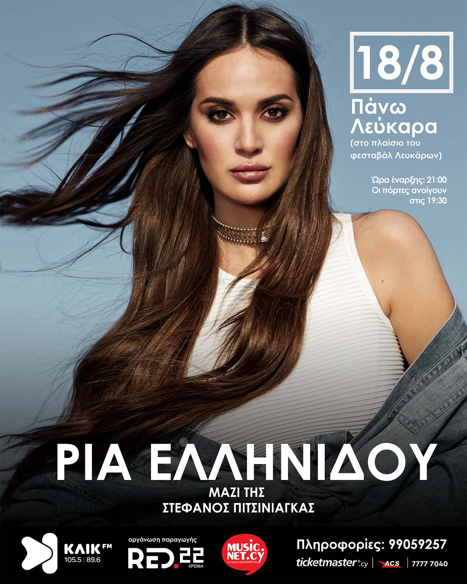 Μία μοναδική συναυλία την Δευτέρα 18/8 στα Λεύκαρα (αυλή δημοτικού σχολείου) με την ανερχόμενη λαϊκή φωνή του σήμερα, Ρία Ελληνίδου που μετά τις επιτυχίες «Στο Λίγο Που Σε Ξέρω» και «Υπερβολές», επιστρέφει δυναμικά με ένα τραγούδι έκπληξη με τίτλο “Κάτι ξέρεις”, που παρασύρει με τους έντονους ανατολίτικους ρυθμούς του.