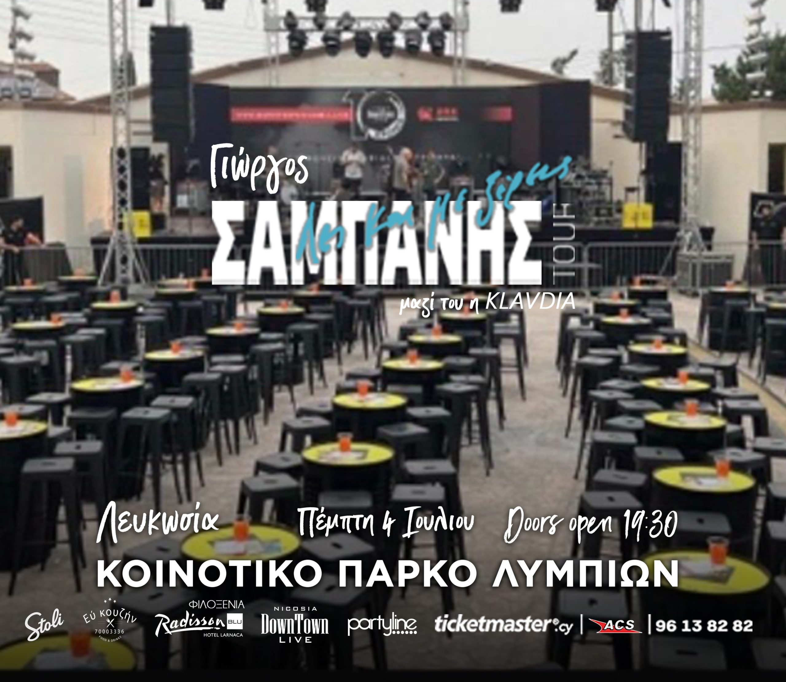 Μεγάλη Συναυλία του Γιώργου Σαμπάνη την Πέμπτη 4 Ιουλίου, Κοινοτικό Πάρκο Λυμπιών στη Λευκωσία. Ο Γιώργος Σαμπάνης δίνει καλοκαιρινό ραντεβού με το κοινό του με συναυλίες σε όλη την Ελλάδα και την Κύπρο!
