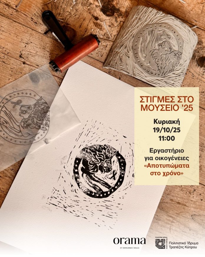 Η δημιουργική ομάδα ORAMA εγκαινιάζει φέτος τη σειρά εκδηλώσεων του Πολιτιστικού Ιδρύματος Τραπέζης Κύπρου Στιγμές στο Μουσείο ’25, με το εργαστήριο χαρακτικής για οικογένειες «Αποτυπώματα στο Χρόνο», τη Κυριακή 19 Οκτωβρίου στις 11:00.
