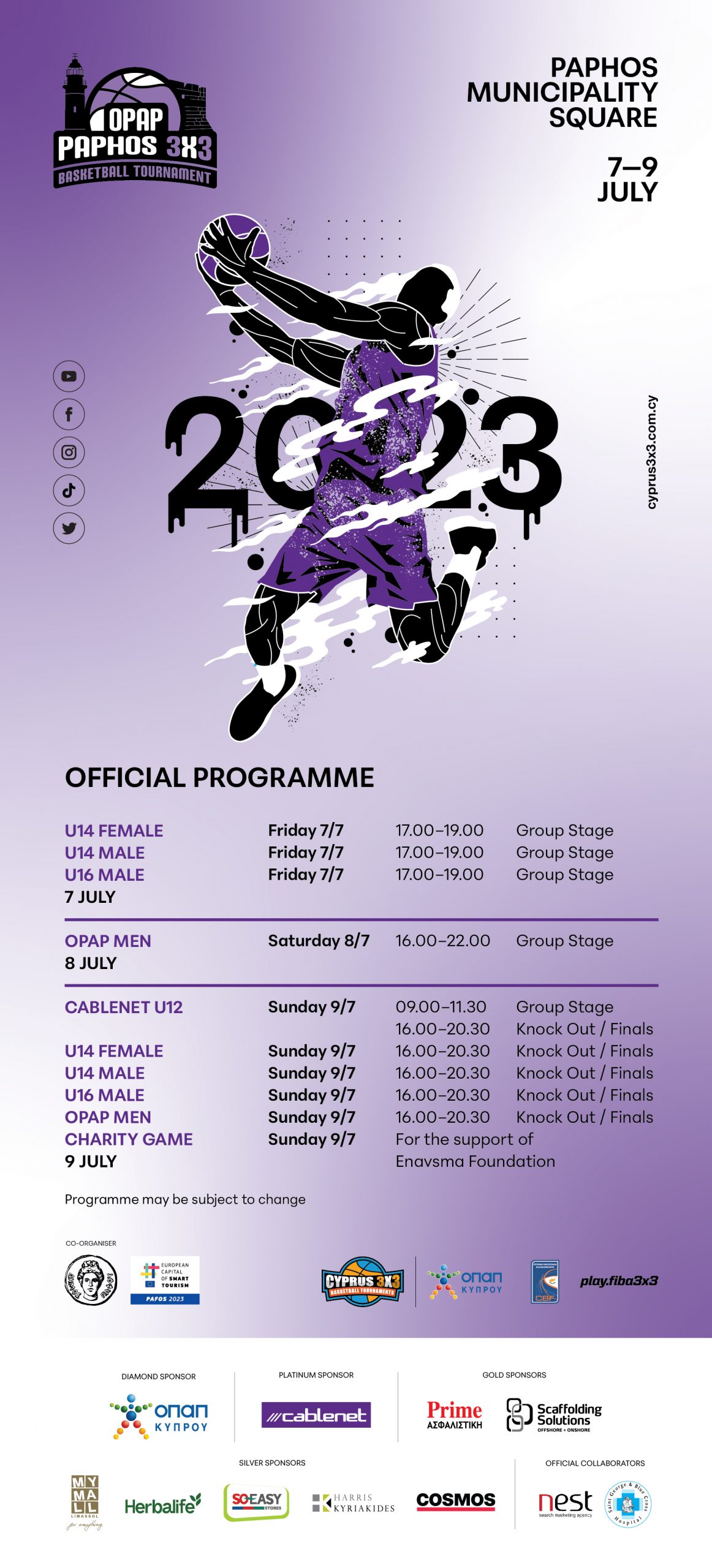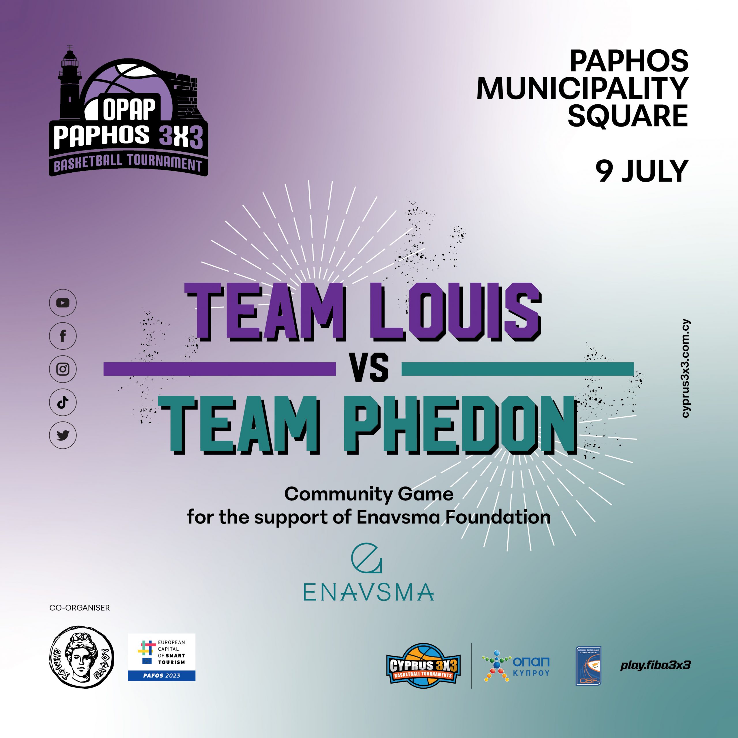 Σας περιμένουμε στη κεντρική πλατεία του Δημοτικού Μεγάρου της Πάφου, μεταξύ 7 & 9 Ιουλίου για μπασκετικές μάχες, μουσική, χορευτικά σόου, διαγωνισμούς και πολλές εκπλήξεις!