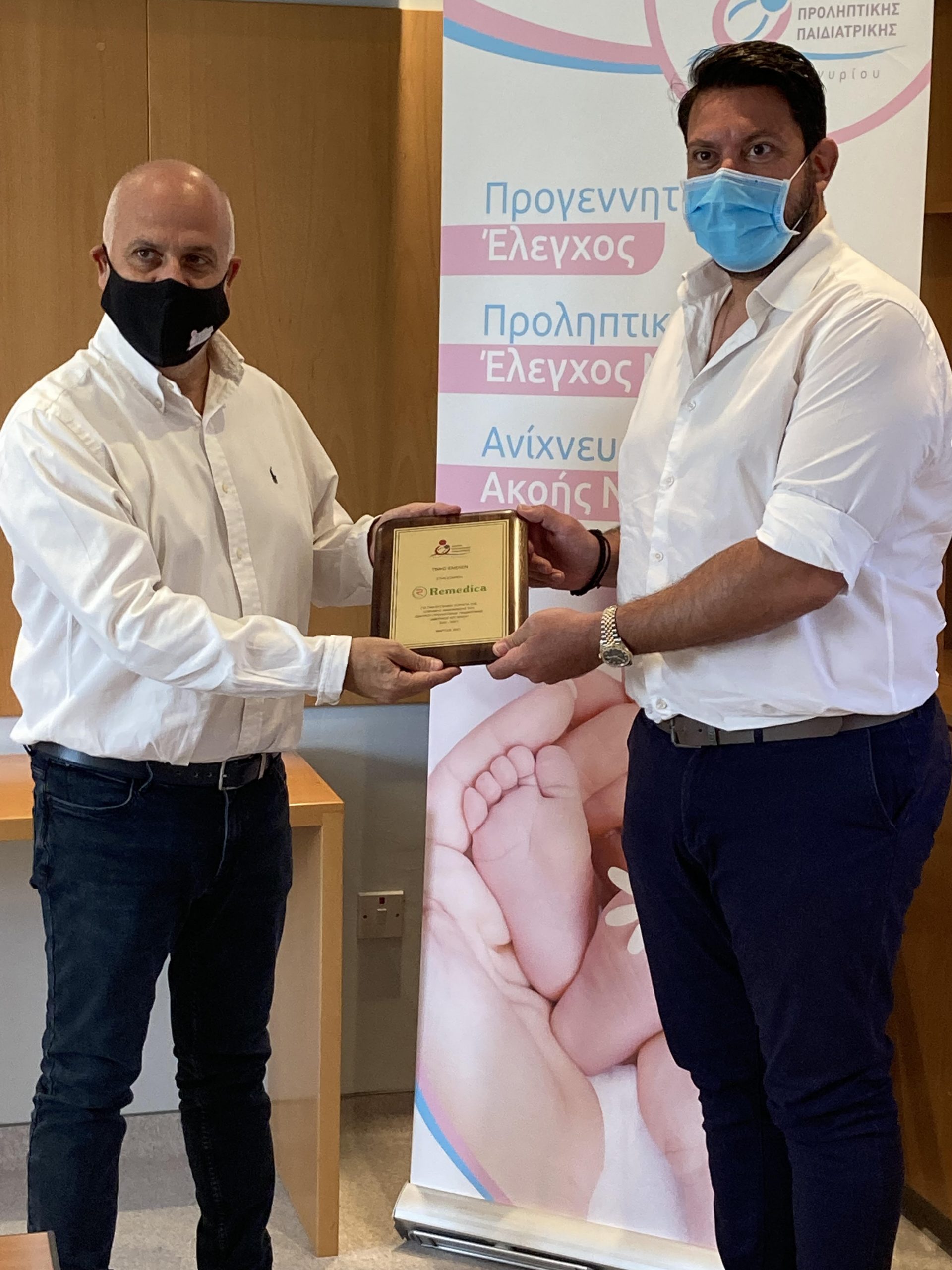 Στα ανακαινισμένα κεντρικά γραφεία του Κέντρου Προληπτικής Παιδιατρικής “Αμερίκος Αργυρίου”, υποδέχθηκε ο Πρόεδρος του Διοικητικού Συμβουλίου Δρ. Αργύρης Αργυρίου και η Διεύθυνση του, τον Ανώτατο Εκτελεστικό Διευθυντή της Remedica Δρ. Μιχάλη Νεοπτολέμου. Με ευκαιρία την πρωτοβουλία που ανέλαβε η εταιρεία να ανακαινίσει σημαντικούς χώρους του κτιρίου του Κέντρου και ως ένδειξη της εκτίμησης της προσφοράς της Remedica, ο Δρ. Αργυρίου εκ μέρους της Διεύθυνσης και του προσωπικού του Κέντρου, απένειμε ειδική ευχαριστήρια πλακέτα.