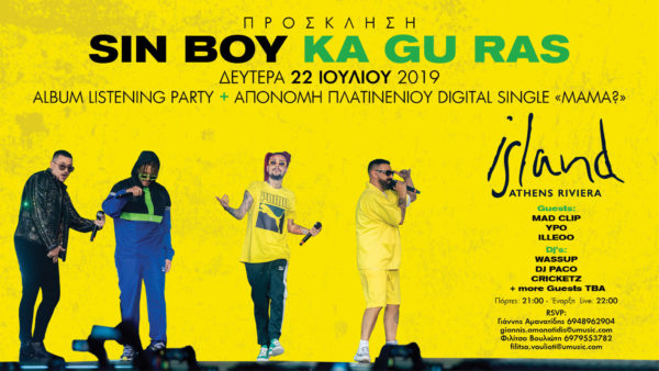 Ο καλλιτέχνης με τα μεγαλύτερα viral hit των τελευταίων ετών στην Ελλάδα, του οποίου το όνομα έχει συζητηθεί όσο κανένα άλλο μέσα στο 2019, γιορτάζει τον ερχομό του πρώτου προσωπικού του album «KA GU RAS», ενώ κατά τη διάρκεια της βραδιάς θα πραγματοποιηθεί και απονομή για τις πλατινένιες ψηφιακές πωλήσεις του digital single “Mama?”.