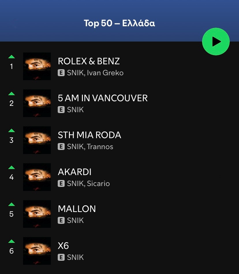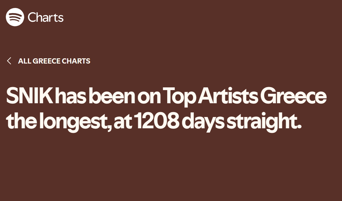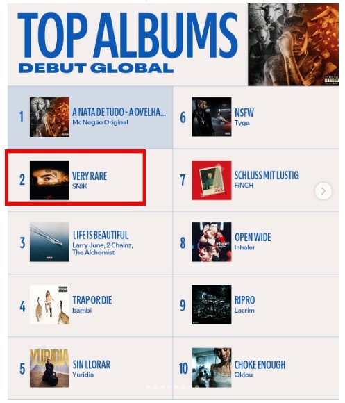 Μια πραγματικά μεγάλη διεθνή διάκριση κατορθώνει ο no1 hitmaker της χώρας, SNIK, καθώς λίγα μόνο 24ωρα μετά την κυκλοφορία του νέου του album “VERY RARE” κατακτά τη 2η θέση στο Top Albums Debut Global Spotify Chart, την υψηλότερη θέση που έχει κερδίσει ποτέ ελληνικό album στα διεθνή chart του Spotify!