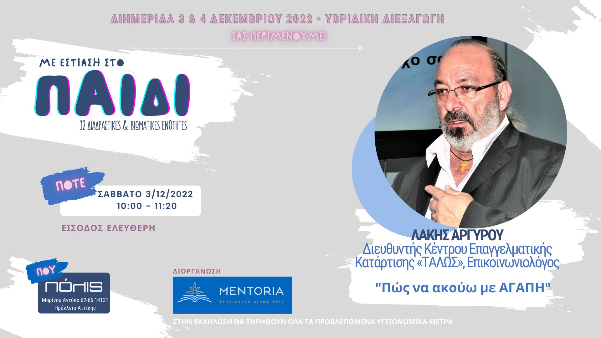 Η Διημερίδα θα πραγματοποιηθεί το Σαββατοκύριακο 3 και 4 Δεκεμβρίου 2022 και περιλαμβάνει δώδεκα διαδραστικές ενότητες με εισηγήσεις – ομιλίες που αφορούν εκπαιδευτικούς και γονείς. Η εισήγηση του κ Αργυρού έχει τίτλο «Πως να ακούω με ΑΓΑΠΗ» και αφορά την επικοινωνία με παιδιά και εφήβους.