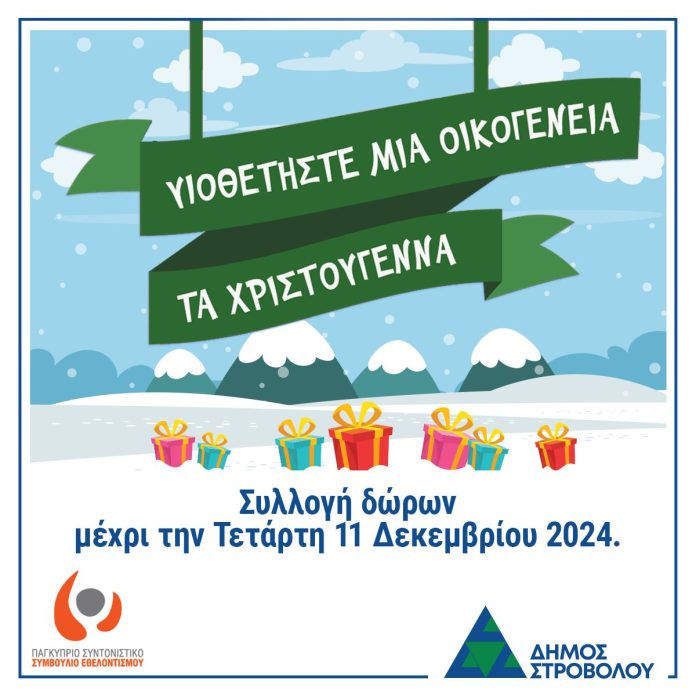 Ο Δήμος Στροβόλου υποστηρίζει την εκστρατεία του Παγκύπριου Συντονιστικού Συμβουλίου Εθελοντισμού (ΠΣΣΕ) «Υιοθετήστε μια οικογένεια τα Χριστούγεννα» για ακόμα μια χρονιά, συλλέγοντας δώρα για παιδιά των οικογενειών που υποστηρίζονται από το ΠΣΣΕ.