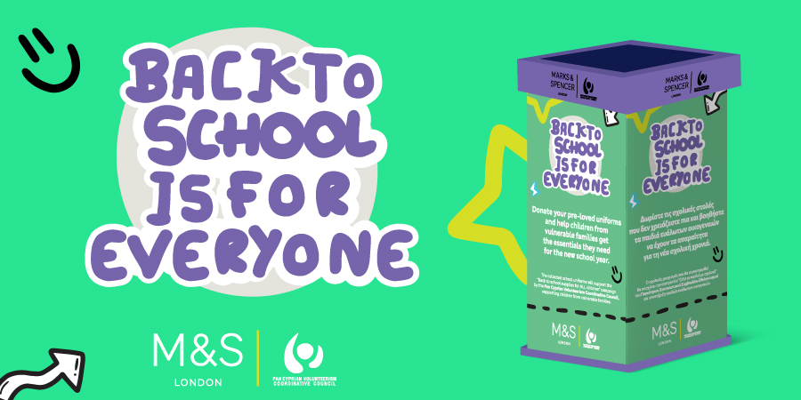 Η πρωτοβουλία “Back to School is for everyone” έχει ως στόχο να βοηθήσει τα παιδιά ευάλωτων οικογενειών έτσι ώστε να αποκτήσουν τα απαραίτητα εφόδια για τη νέα σχολική χρονιά. Σε επιλεγμένα καταστήματα των M&S παγκύπρια έχουν τοποθετηθεί ειδικοί κάδοι περισυλλογής, στους οποίους οι πελάτες κλείνονται να τοποθετήσουν τις σχολικές στολές που δεν χρειάζονται πια. Οι στολές που θα δωρισθούν, θα διανεμηθούν μέσω του Παγκύπριου Συντονιστικού Συμβουλίου Εθελοντισμού σε παιδιά που τις έχουν άμεση ανάγκη. Με τον τρόπο αυτό, τα M&S επιθυμούν να προσφέρουν χαρά, αυτοπεποίθηση και όλα τα εφόδια που θα χρειαστούν οι μαθητές για να ξεκινήσουν τη φετινή σχολική χρονιά.