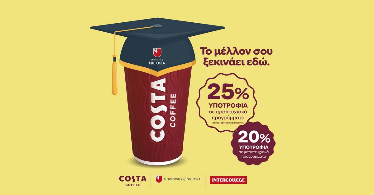 Σε μια νέα ενέργεια – έκπληξη προέβη η αγαπημένη αλυσίδα καφέ Costa Coffee, προσφέροντας μια πολύτιμη ακαδημαϊκή ευκαιρία για σπουδές στο καταταγμένο ανάμεσα στα καλύτερα του κόσμου, Πανεπιστήμιο Λευκωσίας, καθώς και στο κορυφαίο κολλέγιο επαγγελματικής κατάρτισης, Intercollege.