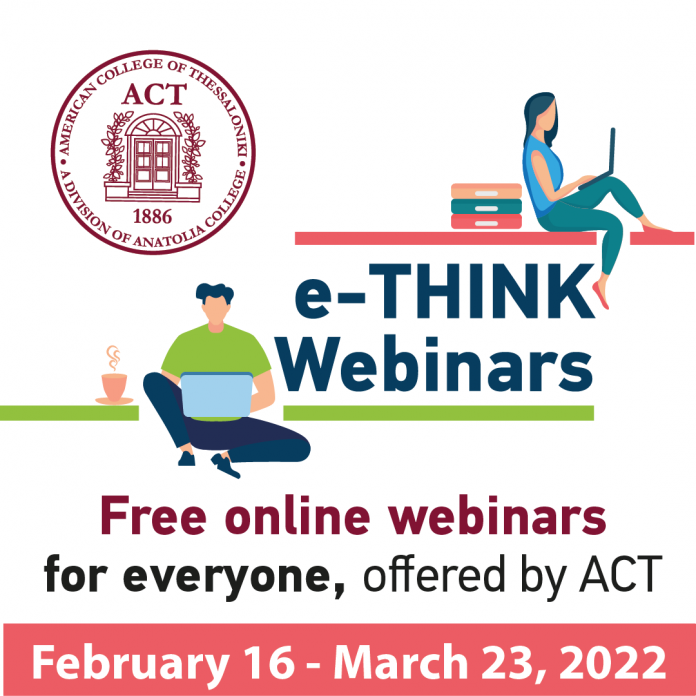 Τα bitcoins, η Μηχανική Μάθηση, η Μαθηματική Φυσική, οι celebrities στη διαφήμιση, το personal branding, η νέα τάση του slam poetry είναι ορισμένα από τα πρωτότυπα και επίκαιρα θέματα που μπορούν να γνωρίσουν μαθητές και μαθήτριες Λυκείου από την Ελλάδα και την Κύπρο στα δωρεάν, ανοιχτά webinars “e-THINK” του ACT- American College of Thessaloniki, μέλους του Κολλεγίου Ανατόλια.