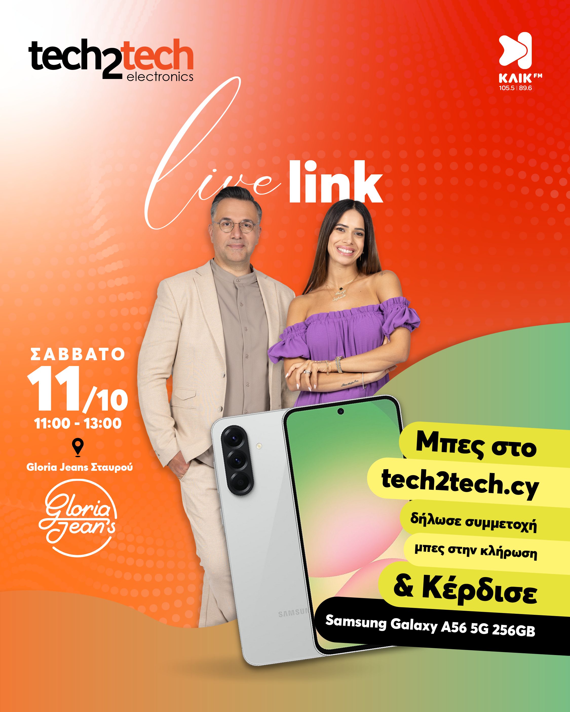 Δήλωσε τώρα συμμετοχή στο tech2tech.cy και κέρδισε το ολοκαίνουργιο Samsung Galaxy A56 5G 256GB αξίας 400€.