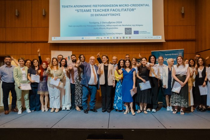 Την Τελετή της Απονομής των Πιστοποιήσεων (Micro-Credential) «STEAME Teacher Facilitator» στους/στις εκπαιδευτικούς που ολοκλήρωσαν επιτυχώς το Πρόγραμμα φιλοξένησε στα Κεντρικά Γραφεία Διοίκησης η Τράπεζα Κύπρου, την Τετάρτη, 2 Οκτωβρίου 2024. Οι πιστοποιήσεις στους/στις εκπαιδευτικούς απονεμήθηκαν από την Υπουργό Παιδείας, Αθλητισμού και Νεολαίας, Δρα Αθηνά Μιχαηλίδου.