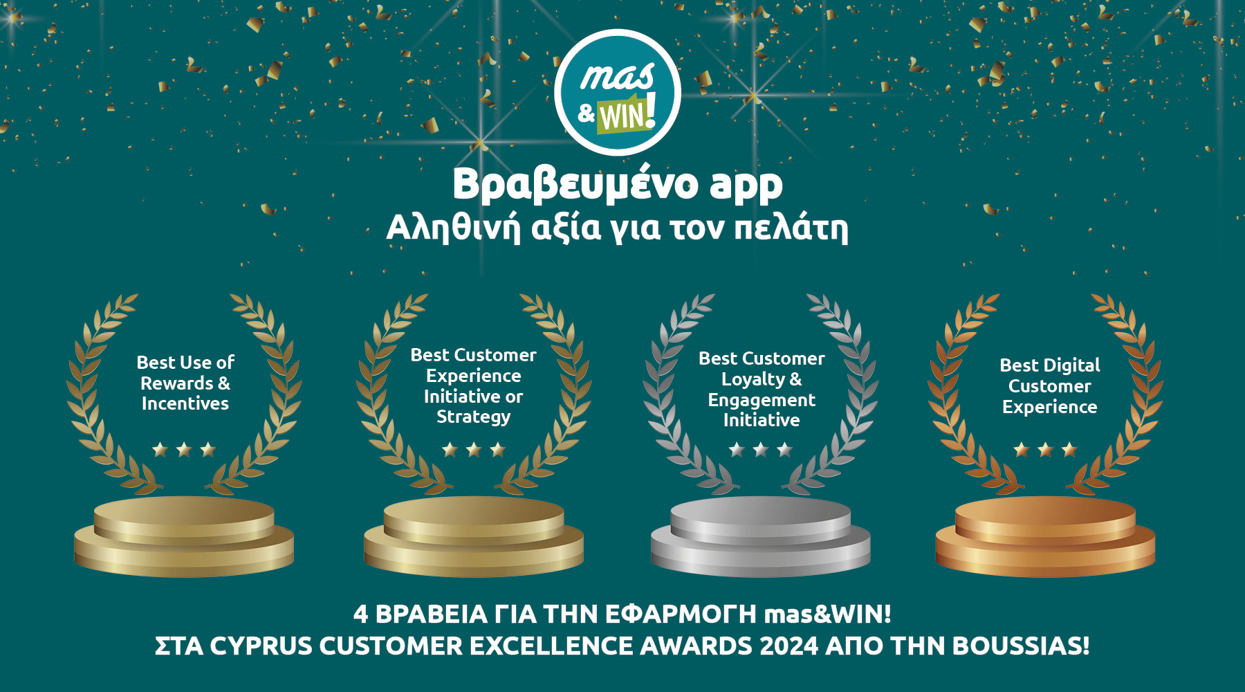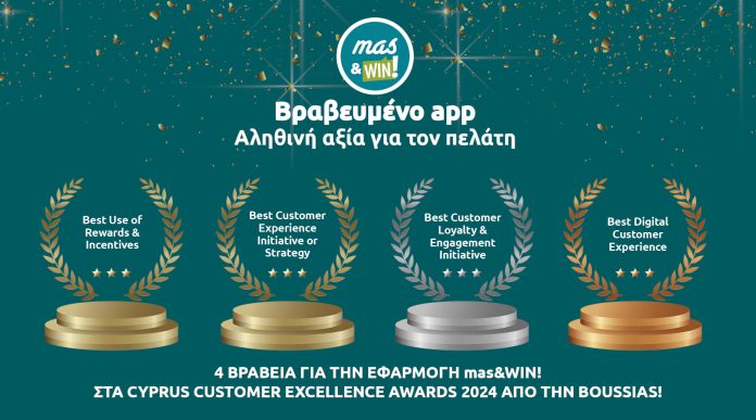 Η εφαρμογή “mas&WIN!”, του Ομίλου Υπεραγορών MAS, απέσπασε συνολικά τέσσερα βραβεία στα Cyprus Customer Excellence Awards 2024 της Boussias Cyprus. Οι διακρίσεις αυτές αναδεικνύουν τη δέσμευση του Ομίλου να εξελίσσεται συνεχώς, επενδύοντας στην καινοτομία, την άριστη εξυπηρέτηση και την ανταμοιβή της εμπιστοσύνης των πελατών του.