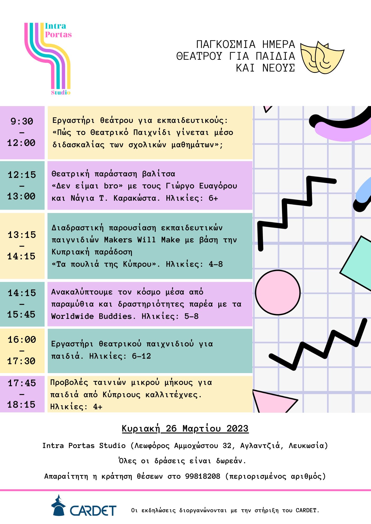 *Με αφορμή την Παγκόσμια Μέρα Θεάτρου για Παιδιά και Νεαρά Άτομα, η ομάδα θα προσφέρει μια δωρεάν παράσταση του έργου «Δεν είμαι bro» την Κυριακή 26 Μαρτίου 2023, στις 12:15 στον καινούριο χώρο της ομάδας «Intra portas studio» (Λεωφόρος Αμμοχώστου 32, Αγλαντζιά).