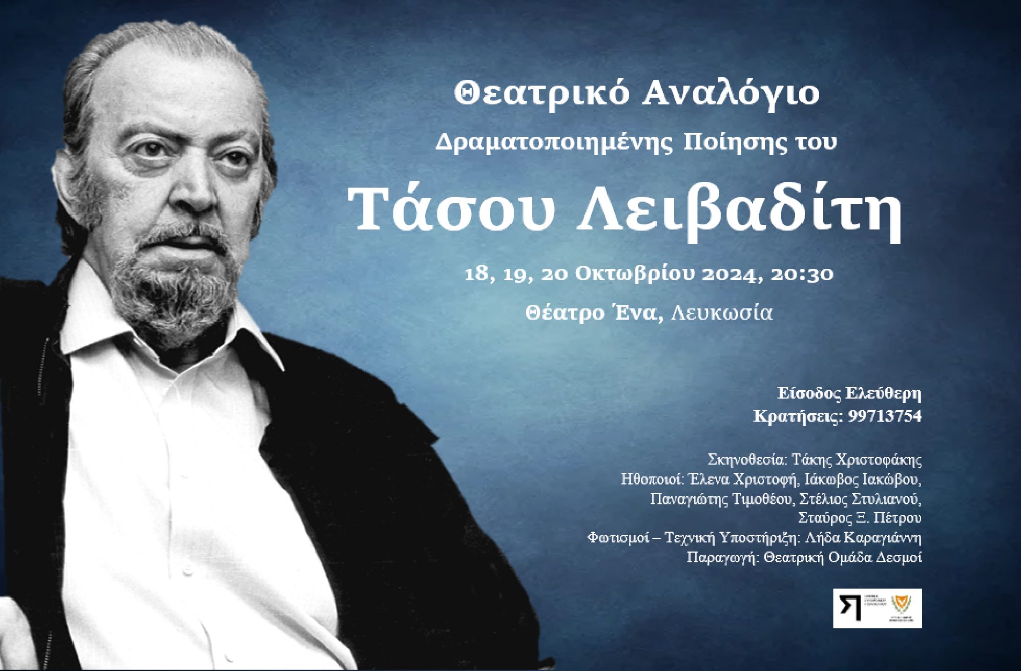 Η Θεατρική Ομάδα Δεσμοί σας προσκαλεί στο Θεατρικό Αναλόγιο Δραματοποιημένης Ποίησης του Τάσου Λειβαδίτη. Ο αέρας που φυσάει σήμερα «στα σταυροδρόμια του κόσμου» κάνει τους στίχους του μεγάλου Έλληνα ποιητή επίκαιρους παρά ποτέ. Ο αντιπολεμικός και βαθιά στοχαστικός λόγος του Λειβαδίτη, λαμβάνει σάρκα και οστά στη σκηνή του θεάτρου για να μας προβληματίσει, «αν θέλουμε να λεγόμαστε άνθρωποι».