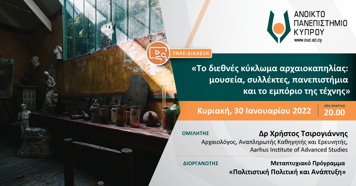 Tο Μεταπτυχιακό πρόγραμμα «Πολιτιστική Πολιτική και Ανάπτυξη» του Ανοικτού Πανεπιστημίου Κύπρου (ΑΠΚΥ) διοργανώνει ανοικτή στο κοινό τηλεδιάλεξη με θέμα «Το διεθνές κύκλωμα αρχαιοκαπηλίας: μουσεία, συλλέκτες, πανεπιστήμια και το εμπόριο της τέχνης» με ομιλητή τον Δρα Χρήστο Τσιρογιάννη, Αναπληρωτή Καθηγητή και ερευνητή στο Aarhus Institute of Advanced Studies του Πανεπιστημίου Aarhus.