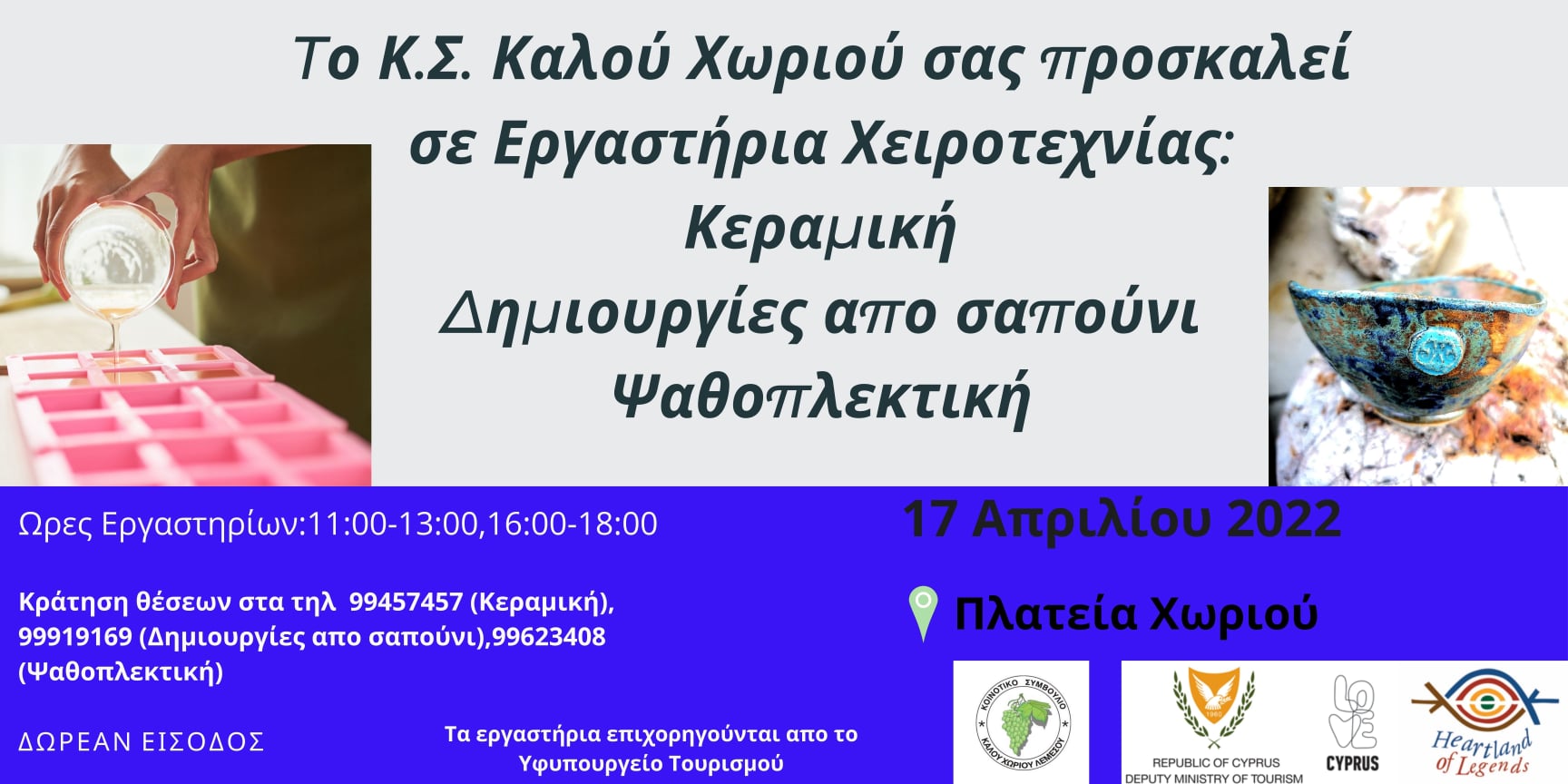 Την Κυριακή 17 Απριλίου προσφέρονται δωρεάν βιωματικά εργαστήρια Χειροτεχνίας στο Καλο Χωριό Λεμεσού. Εργαστήρι Κεραμικής Maria Michael, Εργαστήρι Δημιουργίες απο σαπούνι Maria Skenter , Εργαστήρι Ψαθοπλεκτικής  Ελέμη Ανεμόμυλου