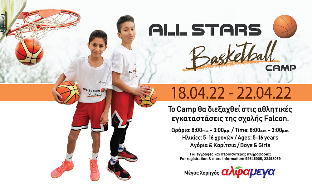 Με διάρκεια 5 ημερών, το “All Stars Basketball Camp” θα πραγματοποιηθεί τη Μεγάλη Εβδομάδα, από τις 18 μέχρι και τις 22 Απριλίου 2022, στις εγκαταστάσεις της σχολής Falcon.  Το All Stars Basketball Camp” υπόσχεται να προσφέρει μία σημαντική και σπάνια ευκαιρία στα παιδιά να γνωρίσουν καλύτερα το άθλημα, να αντιληφθούν τη σημασία της ομαδικότητας και να βελτιώσουν τη φυσική τους κατάσταση, καθώς τη διοργάνωση θα εμπλουτίσουν με την πείρα και τις γνώσεις τους προπονητές καλαθοσφαίρισης, καλαθοσφαιριστές και γυμναστές. Τη φετινή χρονιά θα συμμετάσχει επίσης ο έμπειρος προπονητής καλαθοσφαίρισης Θανάσης Γεωργίου, ως Υπεύθυνος του Τεχνικού Προγράμματος. Για τον σημαντικό ρόλο της σωστής διατροφής, έχει αναλάβει να ενημερώσει και να εφοδιάσει τα παιδιά με πολύτιμες γνώσεις η  Διαιτολόγος – Κλινική Διατροφολόγος και πρώην διεθνής καλαθοσφαιρίστρια Κύπρου, Χριστίνα Παπαδοπούλου-Φεσά.