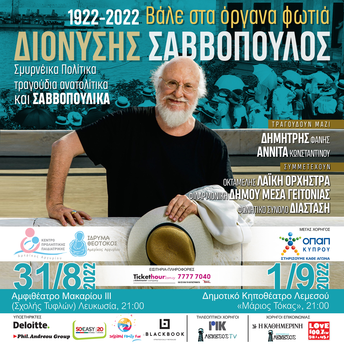Το Ίδρυμα Θεοτόκος και το Κέντρο Προληπτικής Παιδιατρικής «Αμερίκος Αργυρίου» στα πλαίσια της πολιτιστικής τους προσφοράς παρουσιάζουν δύο επετειακές συναυλίες με τον αγαπημένο τραγουδοποιό Διονύση Σαββόπουλο με αφορμή τα 100 Χρόνια από τη Μικρασιατική Καταστροφή που συμπληρώνονται φέτος, με σκοπό την οικονομική ενίσχυση των δύο ιδρυμάτων.