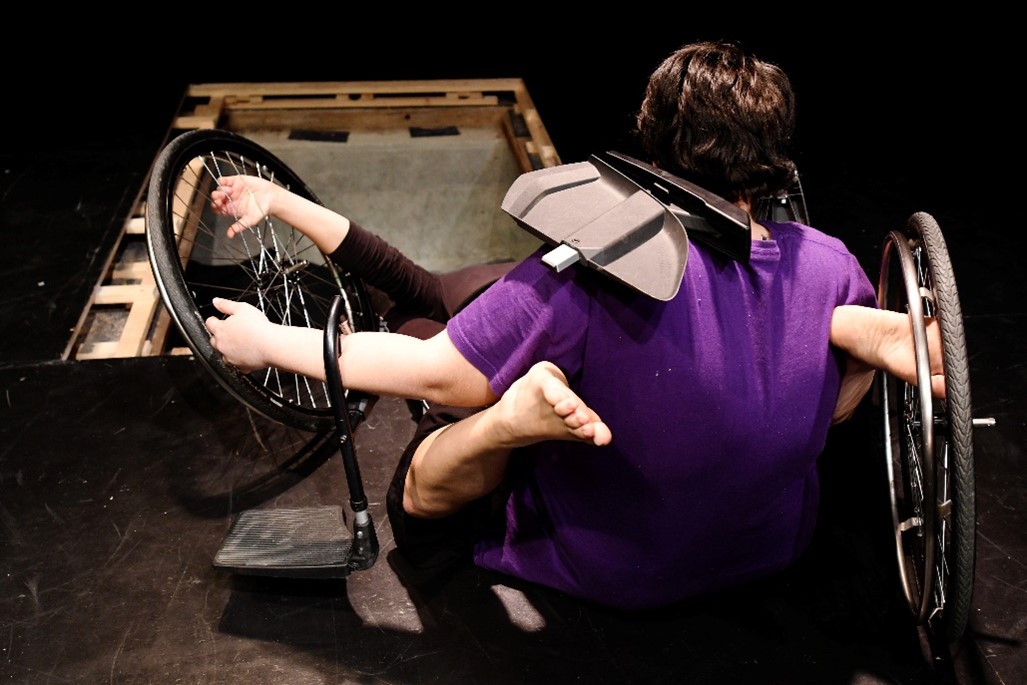 Στην κεντρική φωτογραφία: Ένα σύμπλεγμα αποτελούμενο από μπλεγμένα πόδια, χέρια και μέρη αμαξιδίου, σε μαύρο και μωβ χρωματισμό. Το σύμπλεγμα βρίσκεται μισό πάνω σε μαύρο πάτωμα και μισό βυθισμένο μέσα σε μια καταπακτή. (Φωτογραφία: Παναγιώτης Πασχαλίδης)