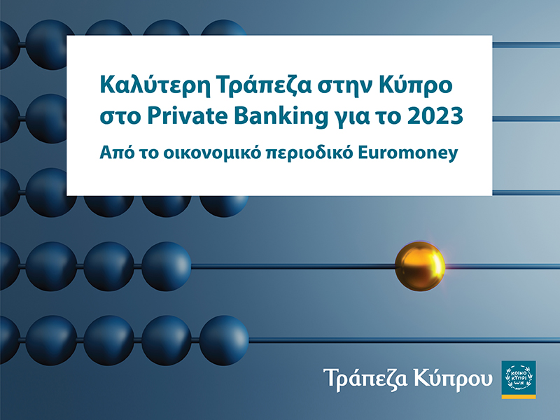 Για έβδομη φορά, η Τράπεζα Κύπρου βραβεύθηκε ως η καλύτερη Tράπεζα στην Κύπρο για το 2023 στο Private Banking, μια διάκριση η οποία επιβεβαιώνει το συγκριτικό της πλεονέκτημα στο κυπριακό τραπεζικό σύστημα.