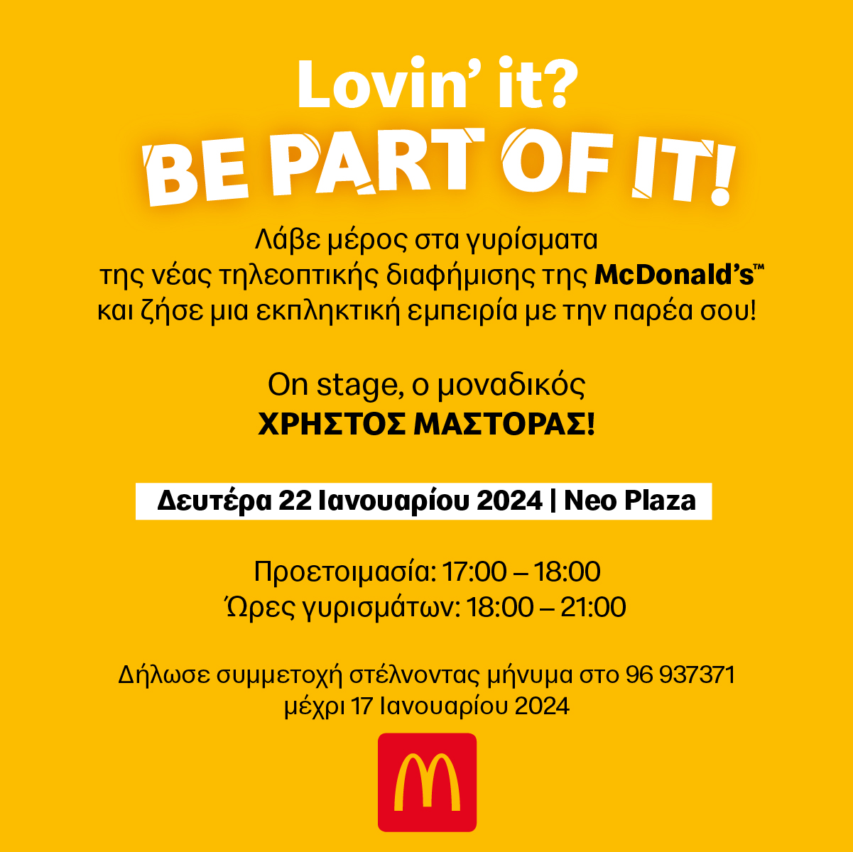 Lovin’ it? Be part of it! Με ένα νεανικό και μυστηριώδες Open Call, η McDonald’s προσκαλεί τους λάτρεις των γεύσεών της (και όχι μόνο…) να συμμετάσχουν στα γυρίσματα της νέας τηλεοπτικής διαφήμισής της. Πιστή στην παγκόσμια δέσμευσή της να δημιουργεί όμορφες και ευχάριστες στιγμές…απευθύνει ανοικτή πρόσκληση στο κοινό για να ζήσουν όλοι και όλες μαζί της μία μοναδική εμπειρία! On stage και o μοναδικός Χρήστος Μάστορας!