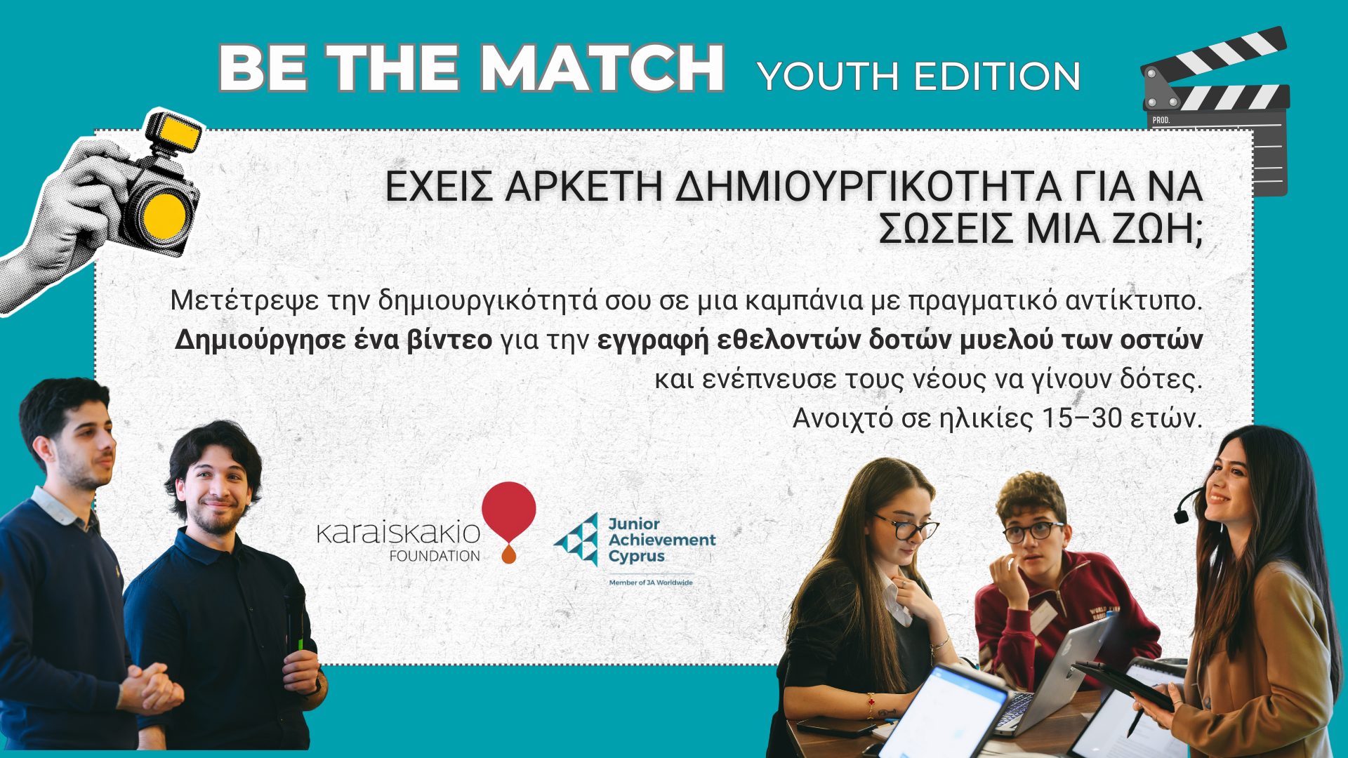 Το πρόγραμμα «Be the Match – Youth Edition» διοργανώνεται από το JA Cyprus σε συνεργασία με το Καραϊσκάκειο Ίδρυμα, με στόχο την κινητοποίηση νέων δημιουργών για τον σχεδιασμό και την υλοποίηση αποτελεσματικών εκστρατειών ευαισθητοποίησης των νέων σχετικά με την εγγραφή νέων εθελοντών δοτών μυελού των οστών.