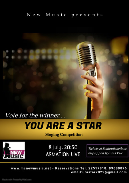 Μια πολύ υποσχόμενη μουσική βραδιά διοργανώνει η New Music School & Recording Studio. 16 νεαροί ταλαντούχοι τραγουδιστές και τραγουδίστριες, θα έχουν την ευκαιρία να αναδείξουν το μουσικό τους ταλέντο και να διαγωνιστούν για την ανάδειξη του νικητή του Παγκύπριου Μουσικού διαγωνισμού «You Are A Star», που θα διεξαχθεί στις 8 Ιουλίου, ώρα 8:30 μ.μ., στη μουσική σκηνή «Asmation Live Stage» στη Λευκωσία.